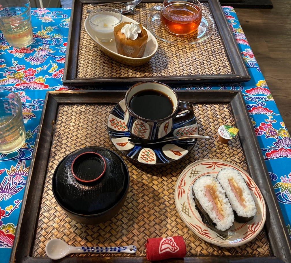 モーニングは、ホットケーキがレギュラーで、プラス料金で「ポークと卵焼きおにぎり」か「マフィン」が選べます。おにぎりをいただきましたが、普通のおにぎりと違って具がたっぷりで食べ応えがあって美味しかったです。