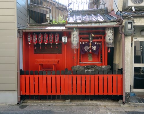 いくら京都とはいえ、思いのほかこじんまりした神社があることも予期してなくはありませんでしたが、基本的に緑→鳥居→神社という探し方をしていたので、正直に言って一度通り過ぎています。民家と民家の間に朱塗りの社が挟まっている感じです。赤い提灯には荒熊大明神、高市大明神、梅春大明神とあり、お稲荷さんでは?とは思いましたが、いろいろ紆余曲折があるのでしょう。