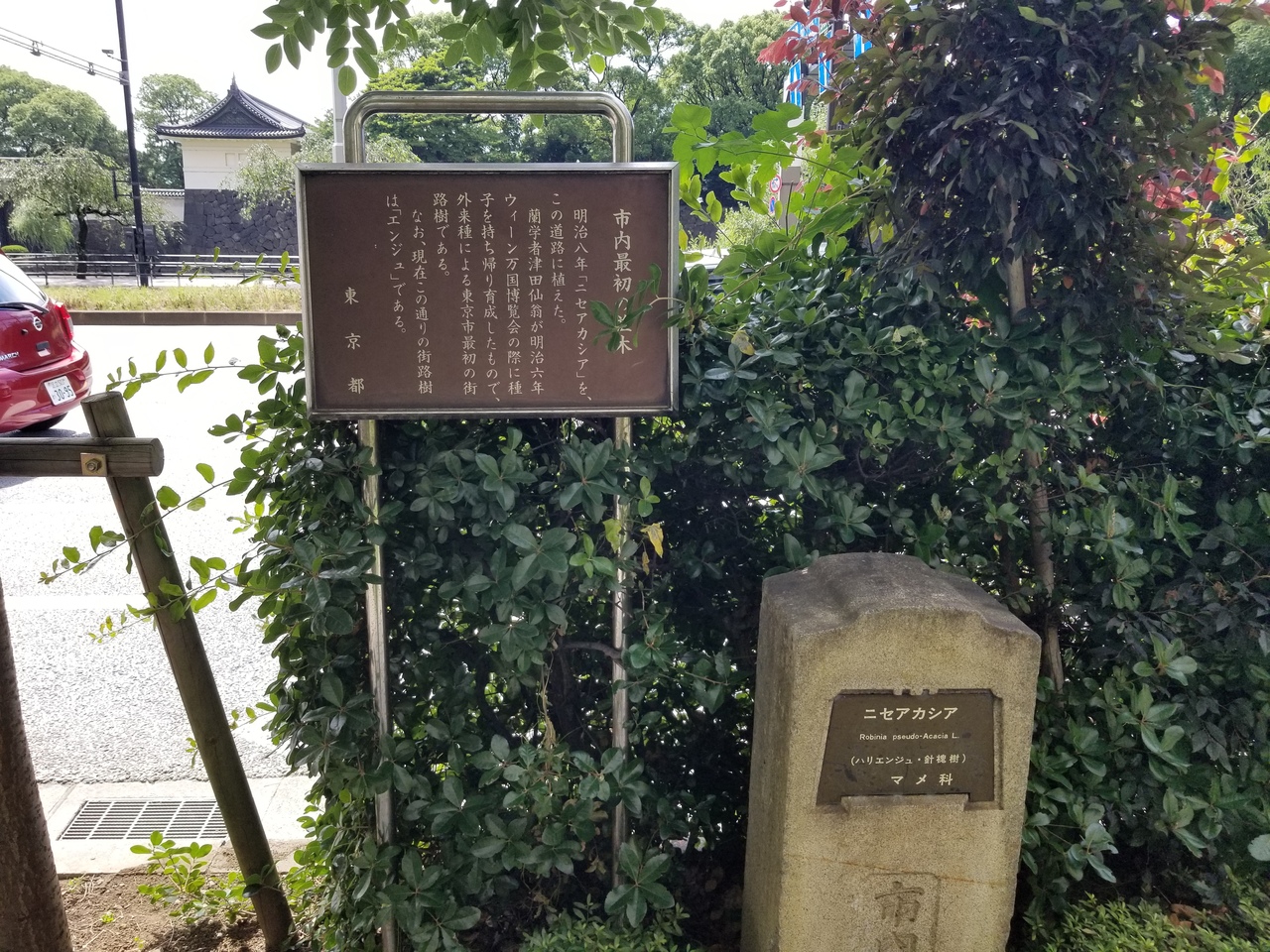 蘭学者津田仙翁が1873年ウィーン万国博覧会の際に種子を持ち帰り育成したもので、外来種による東京市最初の街路樹であるとの事だ。