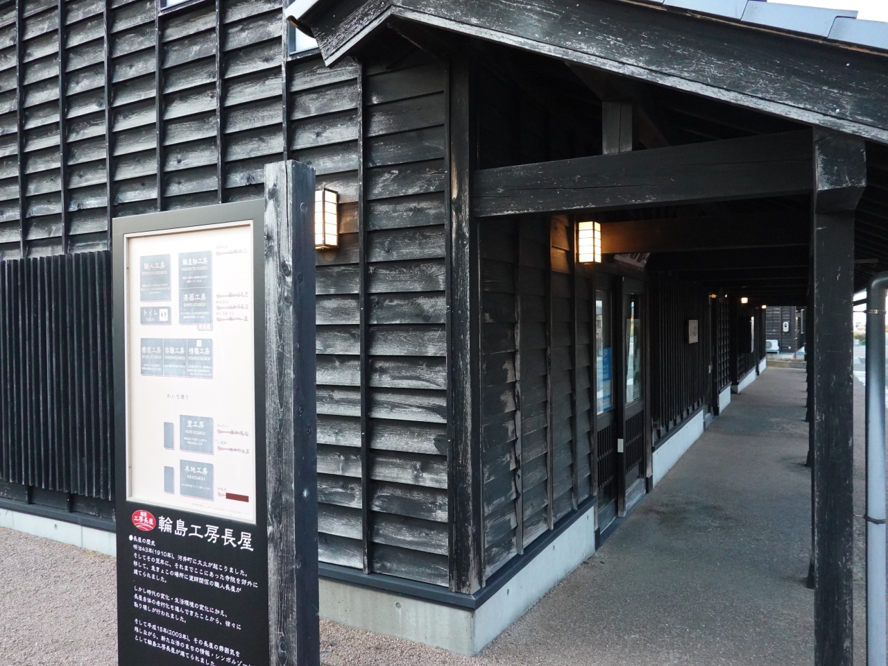 「輪島工房長屋」は輪島朝市が行われる通りのすぐ近くです。輪島らしい黒い板塀の建物が数多く並びます。店舗兼体験工房的な施設で、入場は無料です。職人さんが作業しているところを見学できるなど、輪島塗を身近に感じられる施設です。