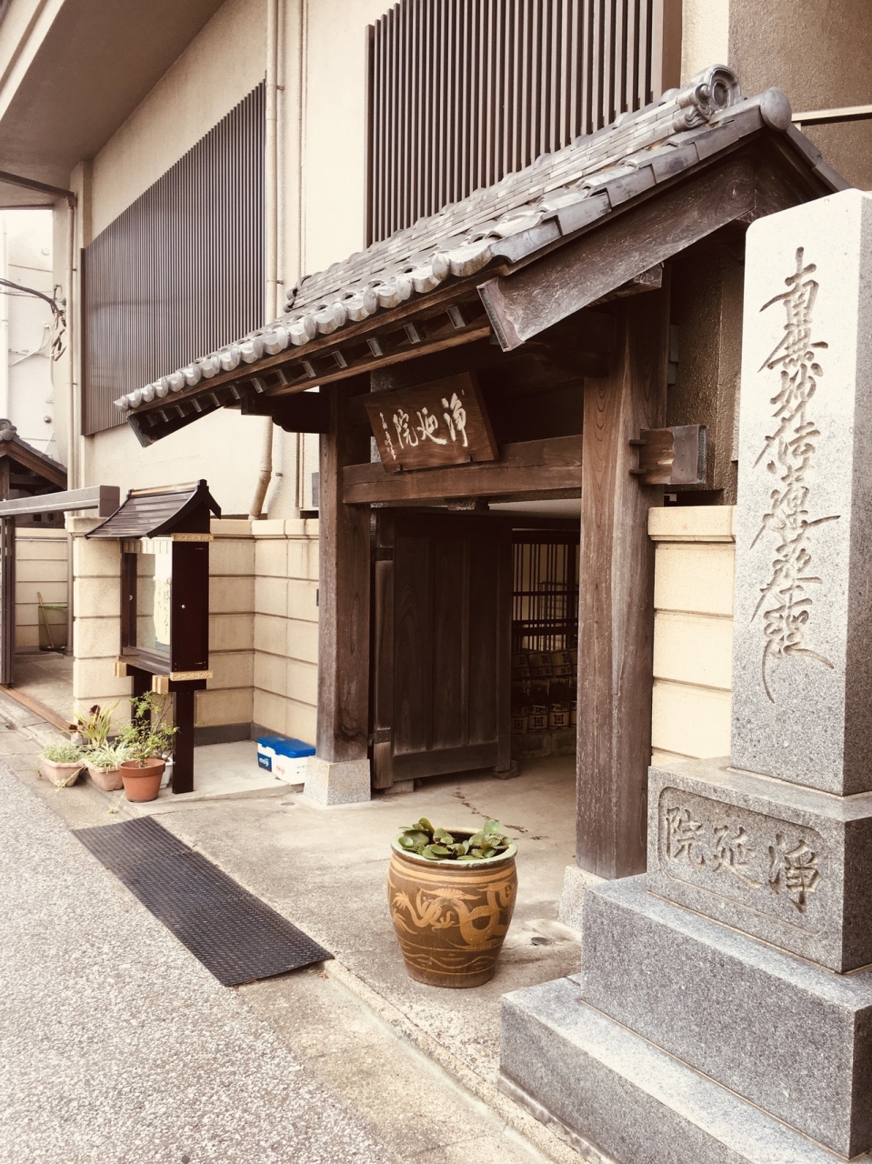 道沿いのお寺が並んだ場所にありました。。横には立派な石碑があって、門は木造りで、境内に入るには建物の下ををくぐって入ることとなります。自宅兼本堂のような感じで賽銭箱もなく、ひっそりとした観光寺院ではないお寺でした。