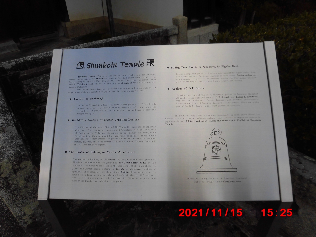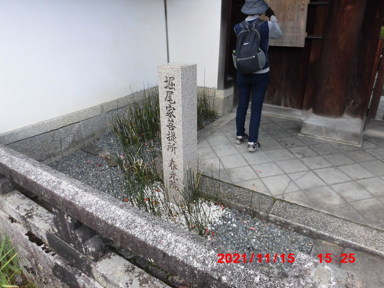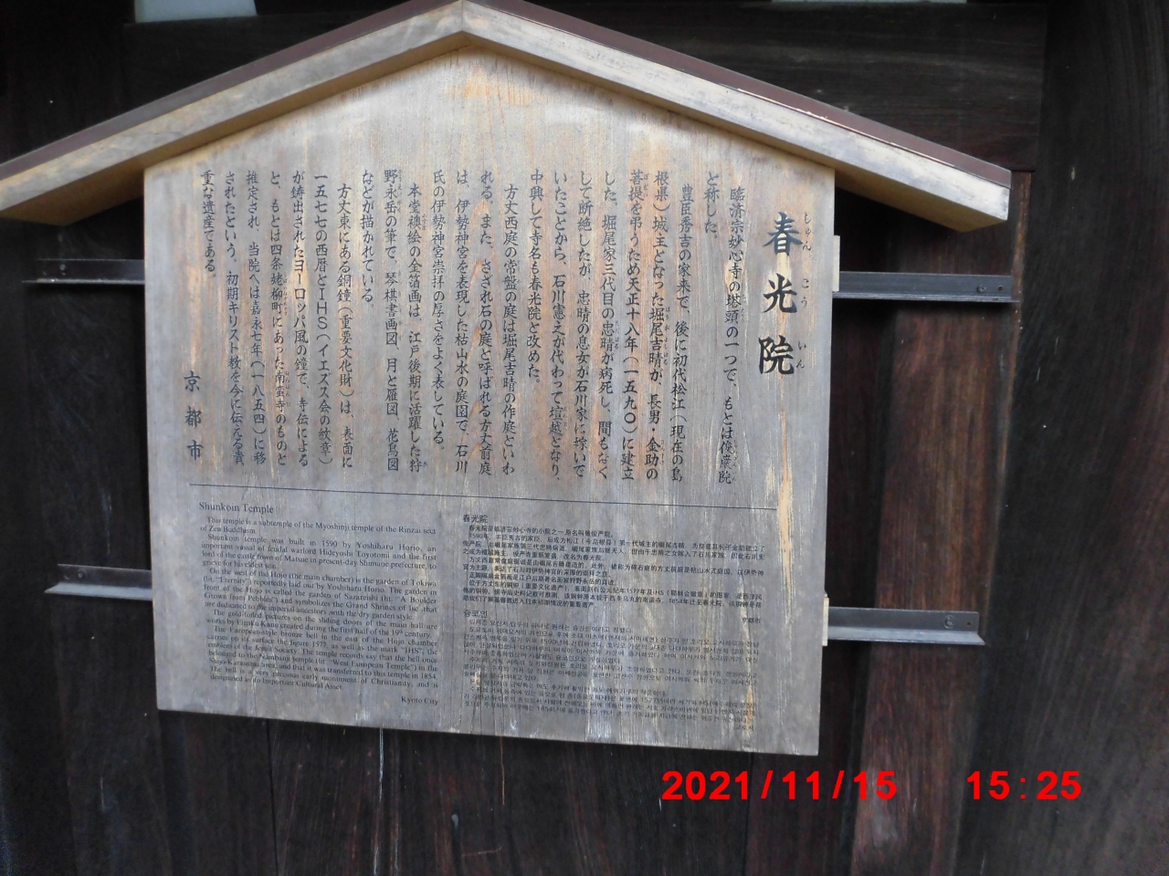 京都市観光で立ち寄りました。妙心寺 春光院は、正法山妙心寺の46の塔頭寺院の一つで、臨済宗妙心寺派に属しています。春光院は、南北に長い妙心寺の広い敷地の中央辺りにあり、創建当時は、堀尾家の長男の戒名に因んで「俊巖院(しゅんがんいん)」という名前でしたが、お家断絶後、縁戚関係の石川家がこの寺を引き継いだ際に、春光院と改名されましたと説明板に書かれていました。