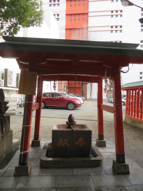 住吉神社と同じく、赤を基調としていて、華やかな雰囲気のする神社です。珍しいことは、手鉢の水の出てくるところが子安貝ということです。子安貝は、子宝、安産のお守りとして、古来より大切にされてきたので、子宝、安産祈願はこちらにどうぞ。