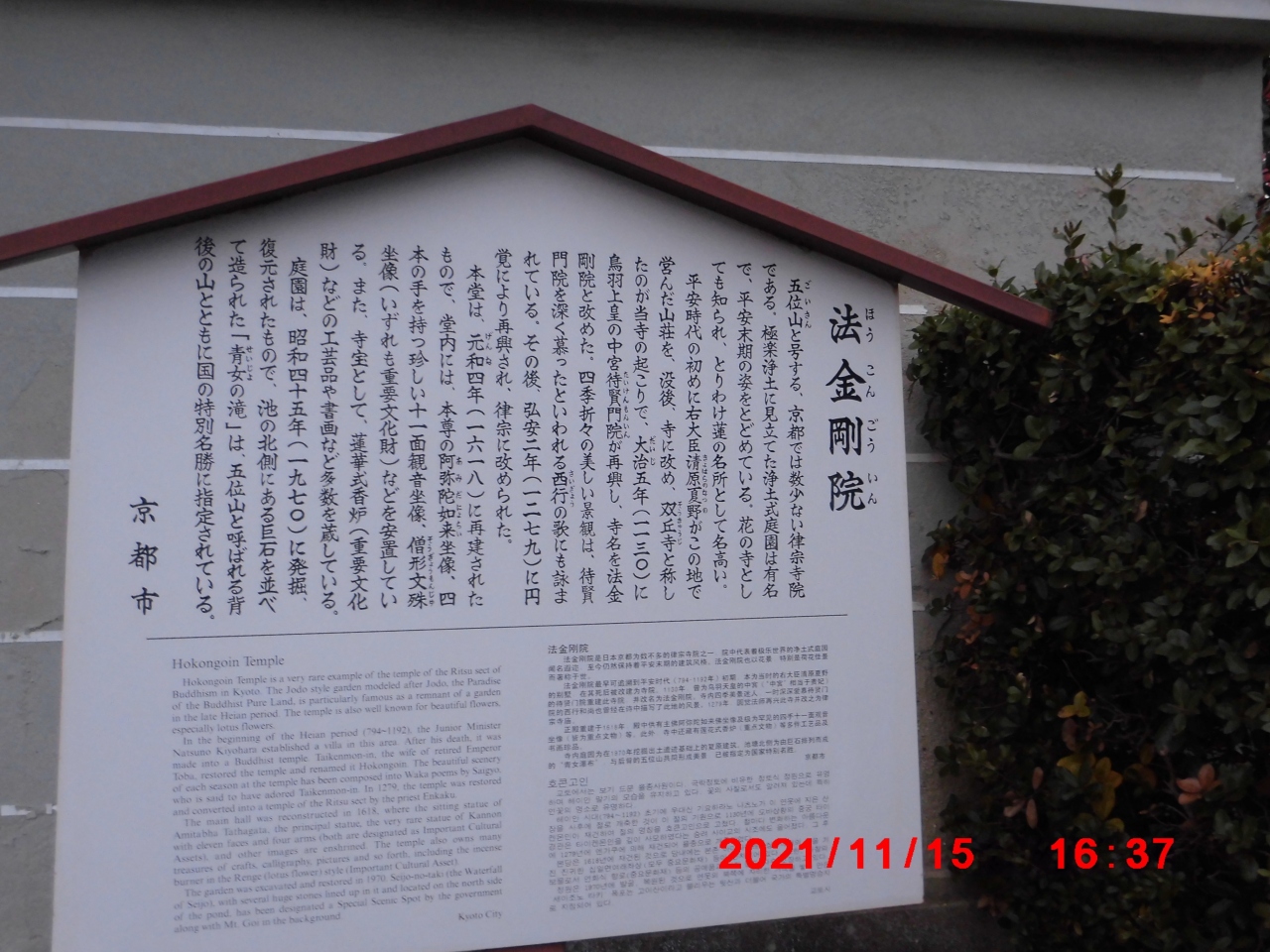 京都市観光で立ち寄りました。五位山法金剛院は、丸太町通り沿い、JR花園駅から北に数分の所にある律宗の寺院で、通称「蓮の寺」、 関西花の寺第一三番霊場です。境内にある、国の特別名勝に指定されている「青女の瀧」は日本最古の人工の滝と言われています。