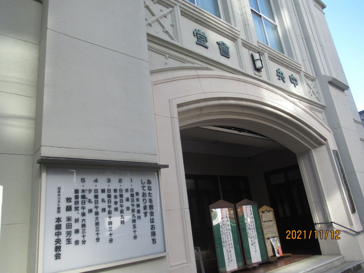 元ヴォーリズ建築事務所が図面を興して、鉄筋コンクリート3階建ての教会を作りました。塔屋は5階建のスケールがあり、見栄えがする建物です。