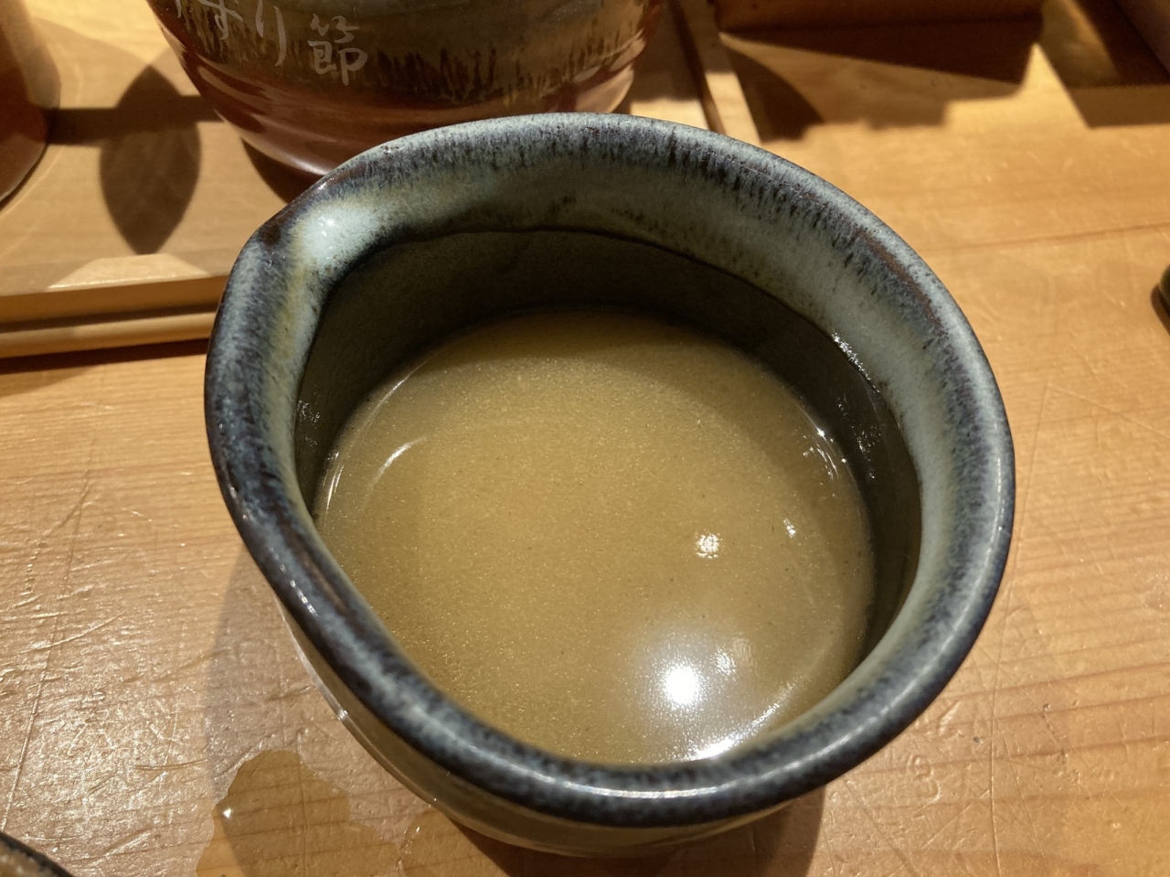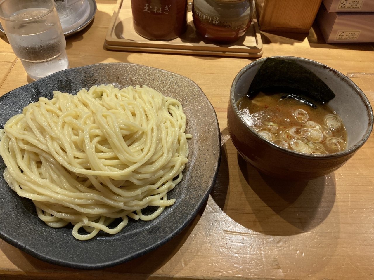 お店こだわりのコシがあってツルツルした麺、ゲンコツと鶏ガラ、香味野菜に煮干しを加えたつけ汁は少し甘みがあって美味。濃厚なものでなく、脂っこくないのがよい。さらに玉ねぎを思いっきり入れると、さらに甘みが増してさらに美味に。チャーシューは、少しあつめに小さく切ったものが入っていて、これもまたいい。削り節や酢を入れることで味変するのも良い。最後にスープ割まで頂いて終了。麺の量は特盛を除き追加料金なしだが、大でも問題なく食べられる。注文してから麺を茹でるので、少々待つのは仕方がない。