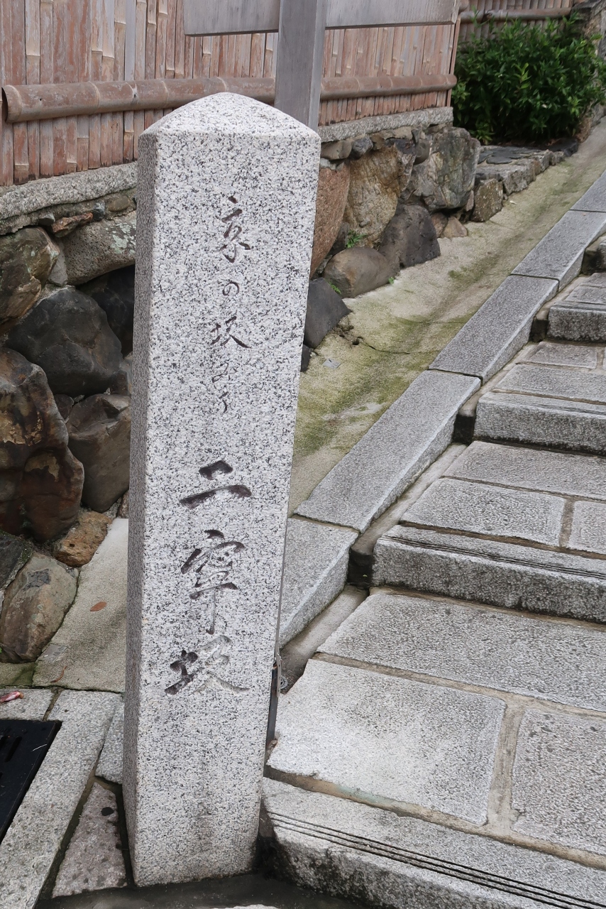 霊明神社から、五重塔を眺めながら龍馬坂を下りてくると、二年坂に出ました。ゆるやかな坂で、途中から階段になっていました。坂に立ち並ぶ町家は、お土産店や飲食店になっています。二寧坂の消え入りそうな文字で書かれた古い説明板には、「ここでつまづき転ぶと二年以内に死ぬ」という不吉な言い伝えがあったと書かれていました。今は、京都らしい町並みを背景に和装で結婚記念写真を撮影している人もいて、明るくにぎわっていました。