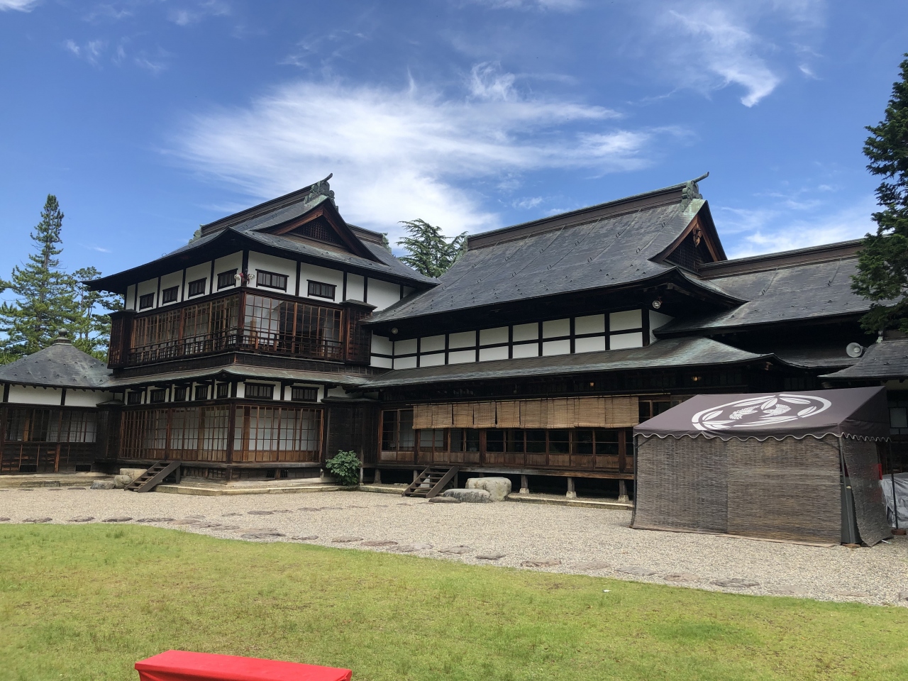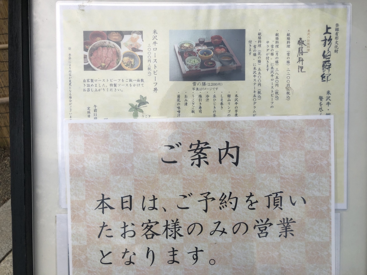 米沢名物の米沢牛など郷土料理を提供するレストランである。この日は予約者のみで、入ることはできなかった。第14代当主であった茂憲の邸宅として大正時代に建てられたもので、建物は銅板葺き、総桧、2階建。昭和25年に公民館として一般に開放され、現在は上杉記念館となっている。浜離宮を倣った庭園は米沢三名園のひとつ、庭園は出入り自由で、館内も時間内であれば見学は無料である。