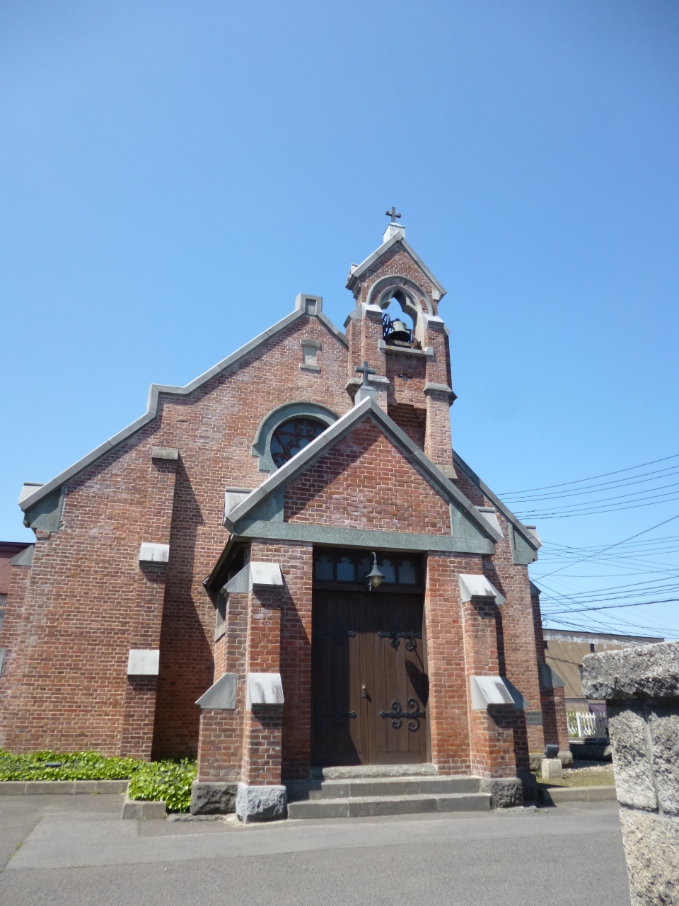 弘前の市街地、中央弘前駅の近くにあるイギリス積の赤煉瓦が印象的な教会です。設計は、京都聖ヨハネ教会堂や函館の遺愛女学校校舎を設計した、ジェームス・ガーディナーです。外壁の控え壁があり、正面の立体的な様子が荘厳さと親しみやすさを感じさせます。