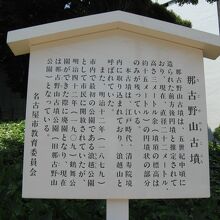 大須商店街の少し北側、那古野山古墳公園の中にあります。説明板によると五世紀中ごろに造られた前方後円墳だった推定され、現在は円墳部分しか残っていなとか。周りはビルや建物に囲まれていて説明板がないとただのこんもりした丘のような感じのところです。
