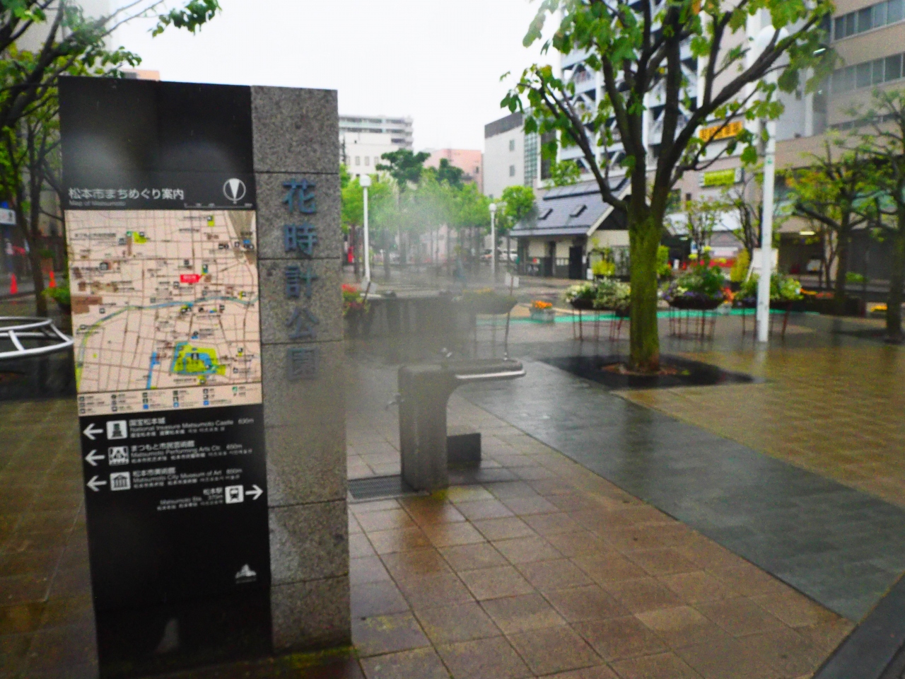松本市街地の中心部のパルコの南側にある公園です。街なかにある公園なので、それほど広くはありませんが、長方形の公園で、公園内にはベンチなどともに花壇やプランターなどが置かれており、いろいろの花々が見られます。松本は花いっぱい運動をしているので、その代表的な場所のようです。