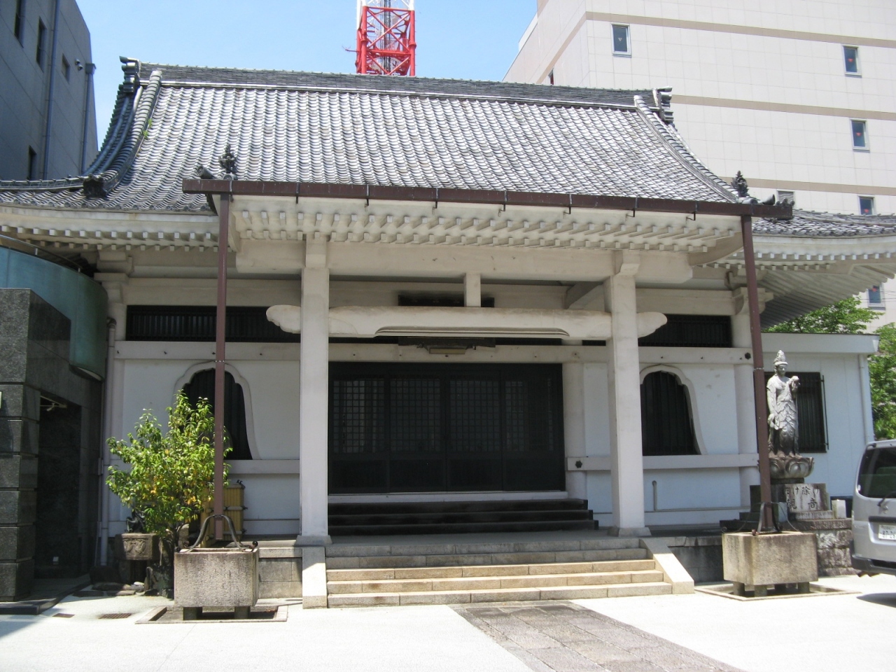 由緒書きが見当たらず創建や開祖など詳しい歴史が判りませんでした。ビルを背景に立派な蔵の様な本堂はコンクリート造りで、境内も大部分がコンクリートで敷かれていて植栽などはほとんどなく殺風景で歴史を感じる雰囲気はありませんでした。