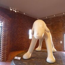 弘前駅から歩くと20分ほどかかるところに、土淵川吉野町緑地があり、その中に、弘前れんが倉庫美術館があります。以前は倉庫前屋外の芝生の上に展示されていたり、犬小屋風のイメージの場所に展示されていたようですが、現在は、美術館のエントランスに展示されていて、出迎えてくれます。周囲に余裕もあるので、全体を見ることもできます。