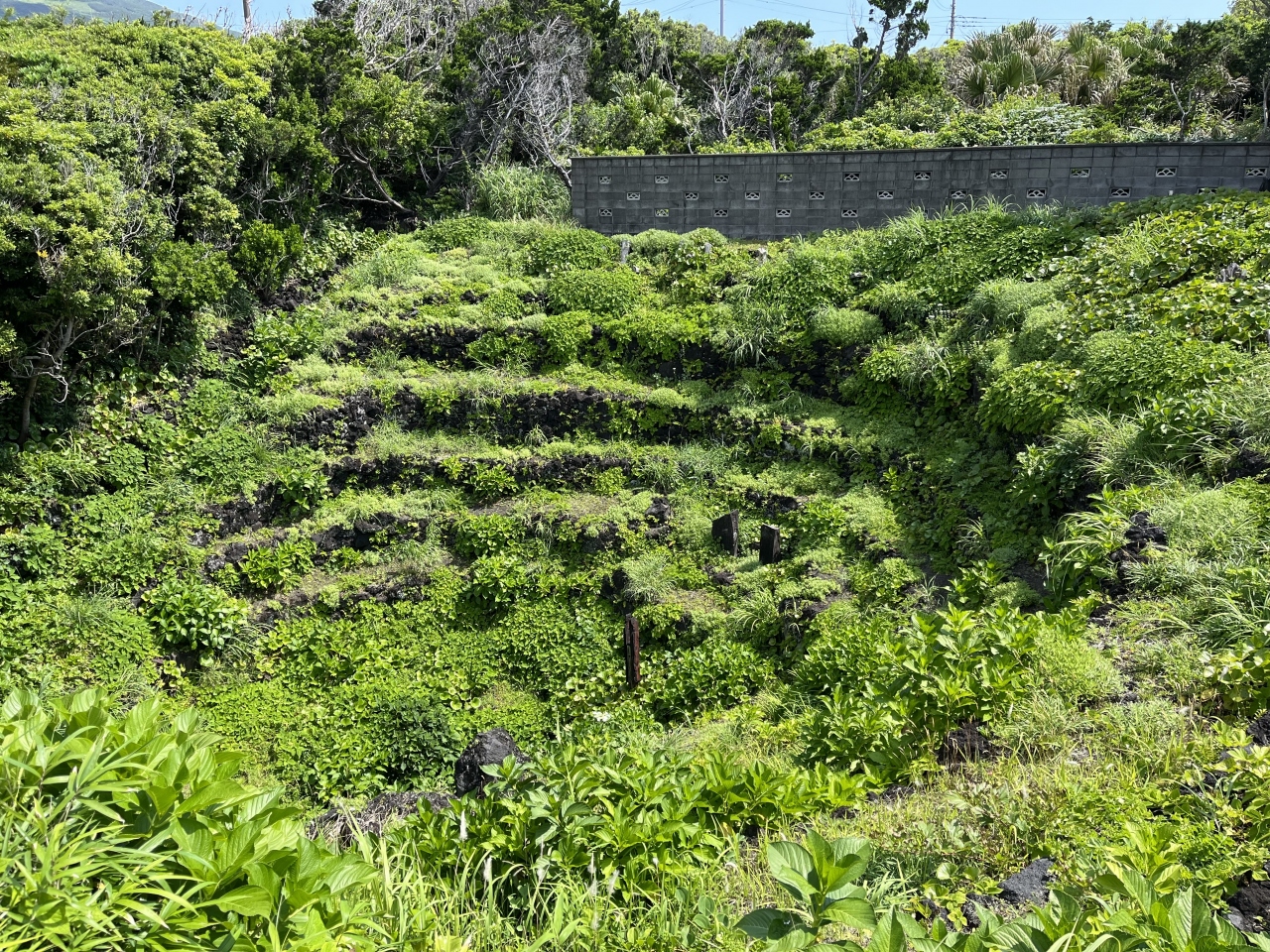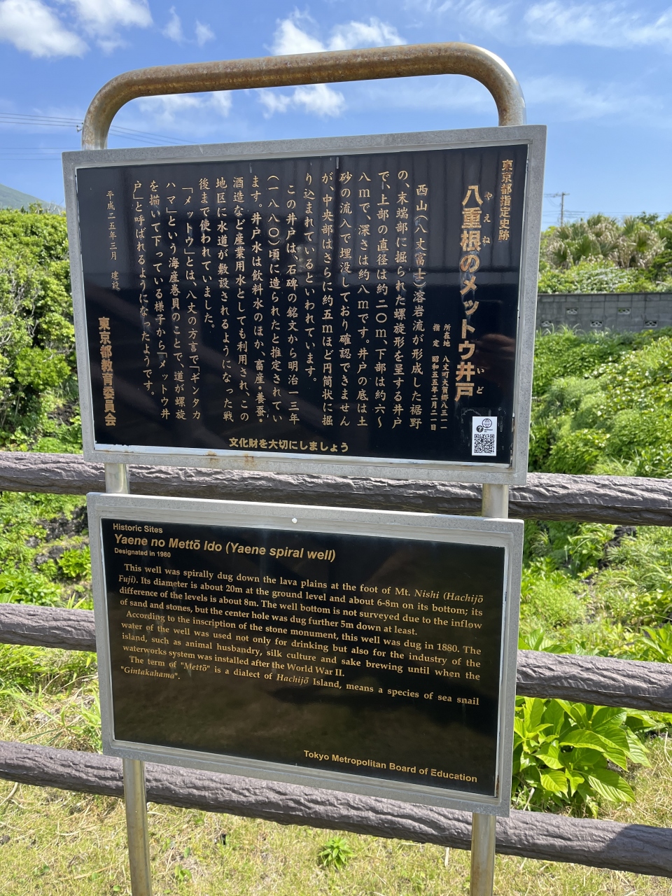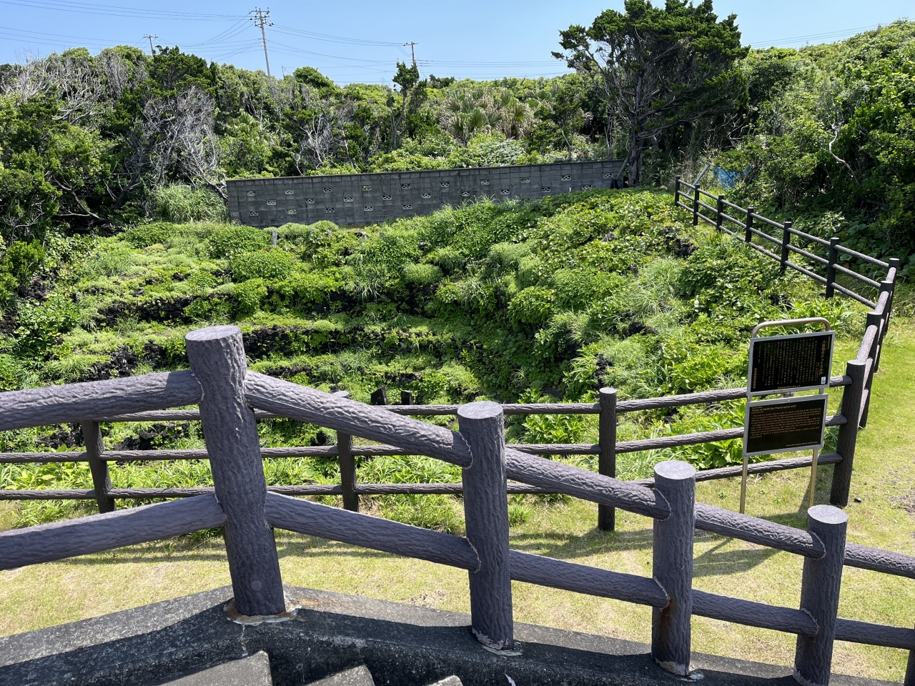 八重根港の近くで、南原千畳敷からも近かったです。すり鉢状の形をしていて、井戸という言葉から想像するよりもずっと大きなものでした。「メットウ」とは、八丈の方言で巻貝のことだそうです。確かに、らせん状で巻貝のように見えました。