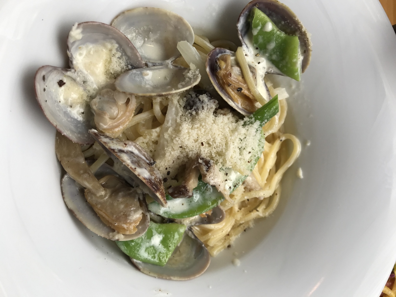 今回は、アサリとスナップエンドウのクリームパスタをいただきました。