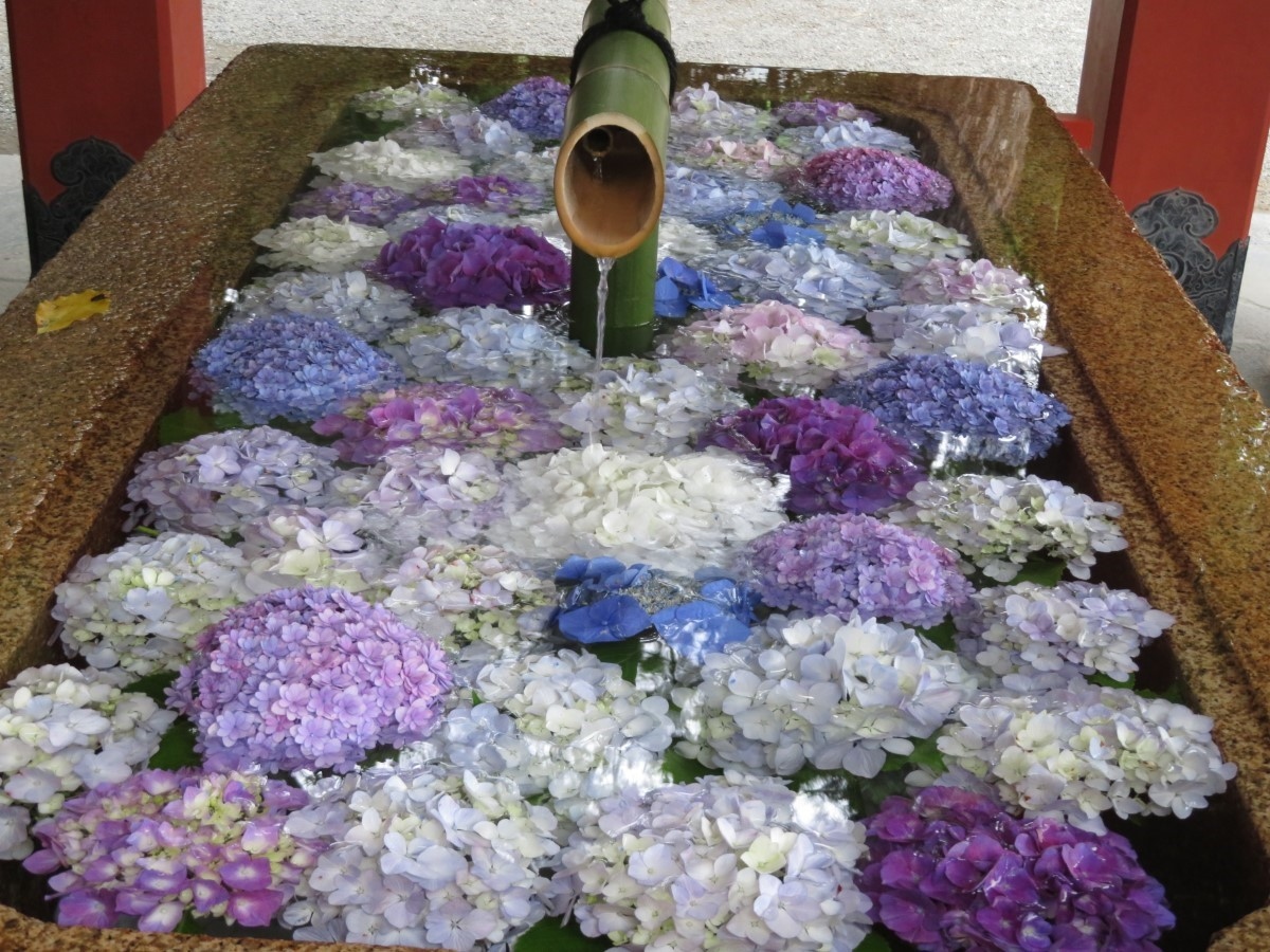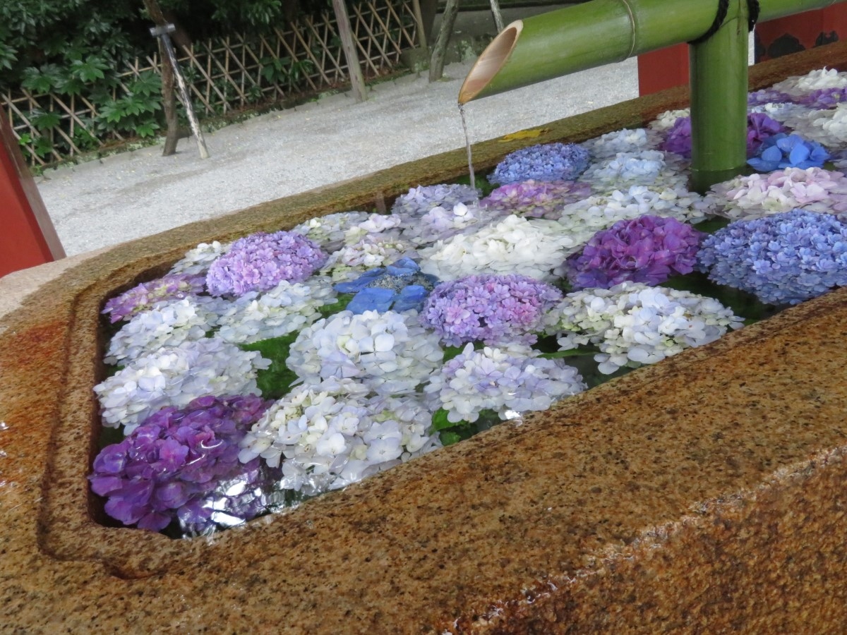 季節ごとに花手水が行われていると聞き、ちょうど紫陽花の花手水が始まった6月中旬に訪れました。