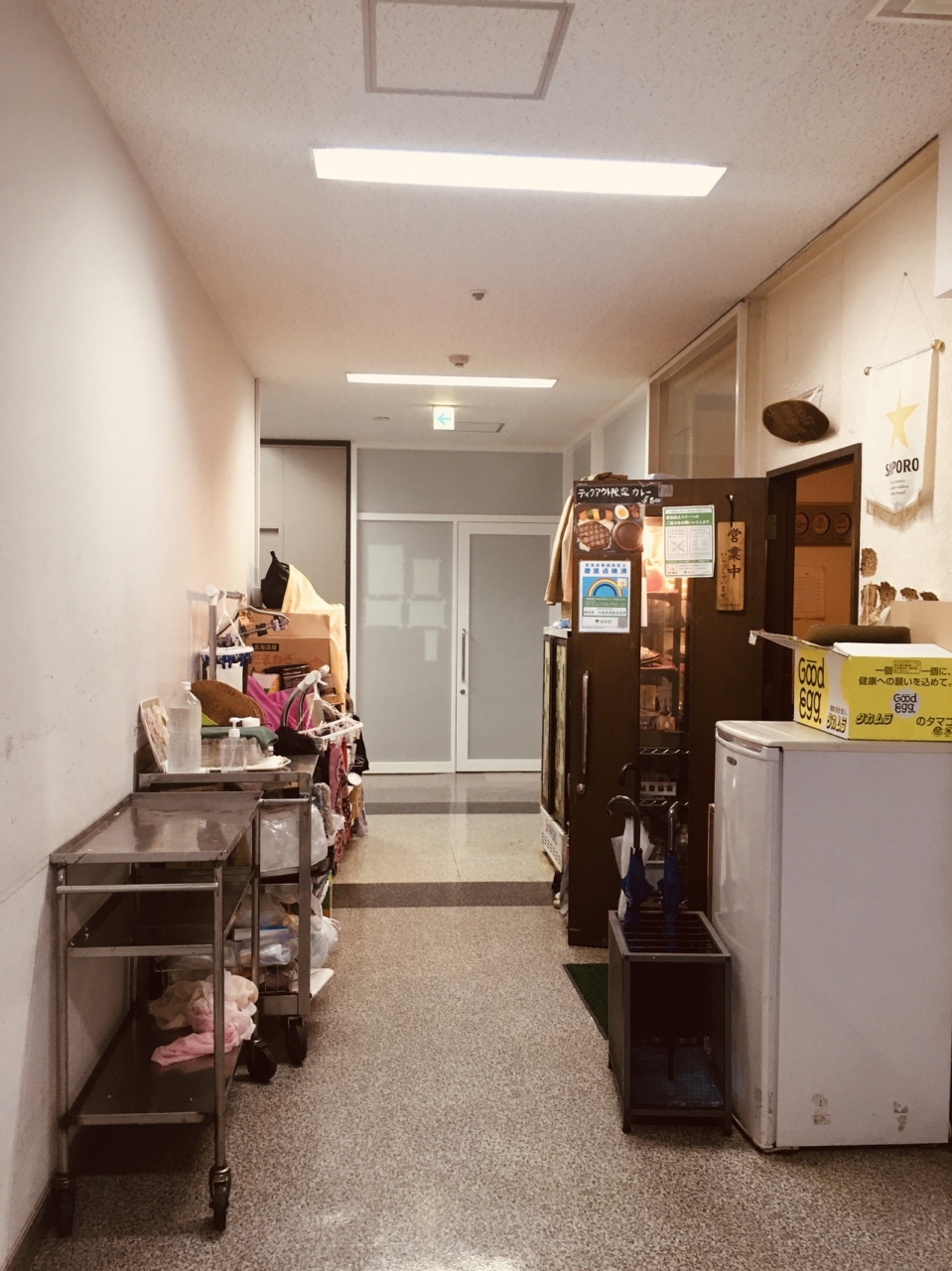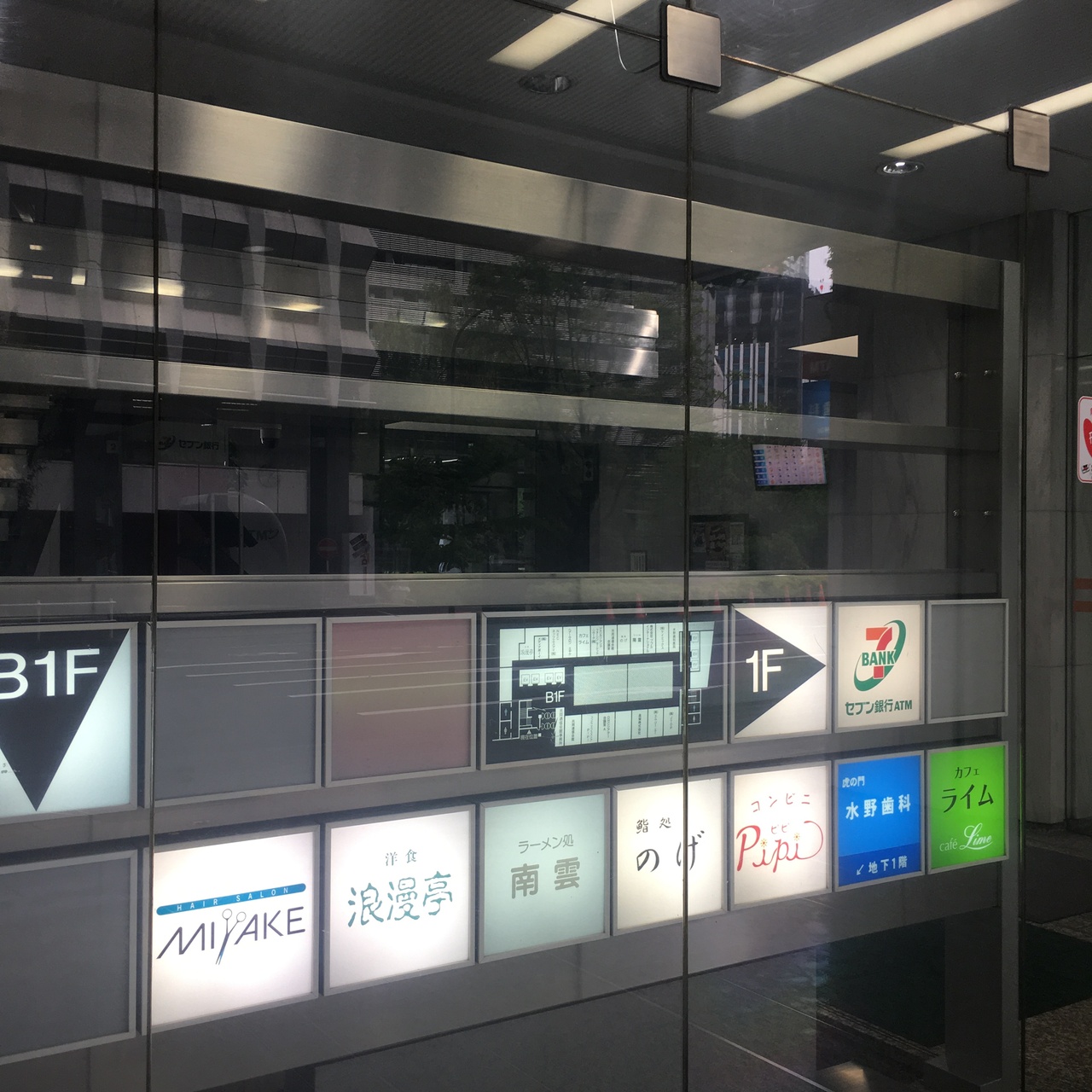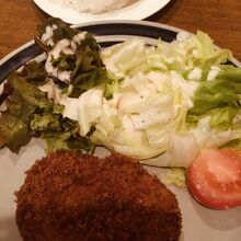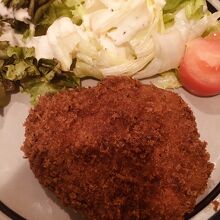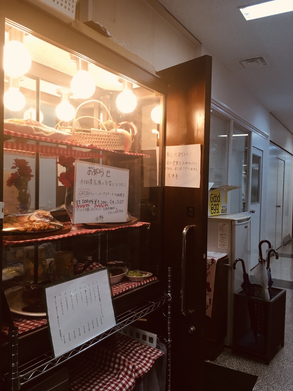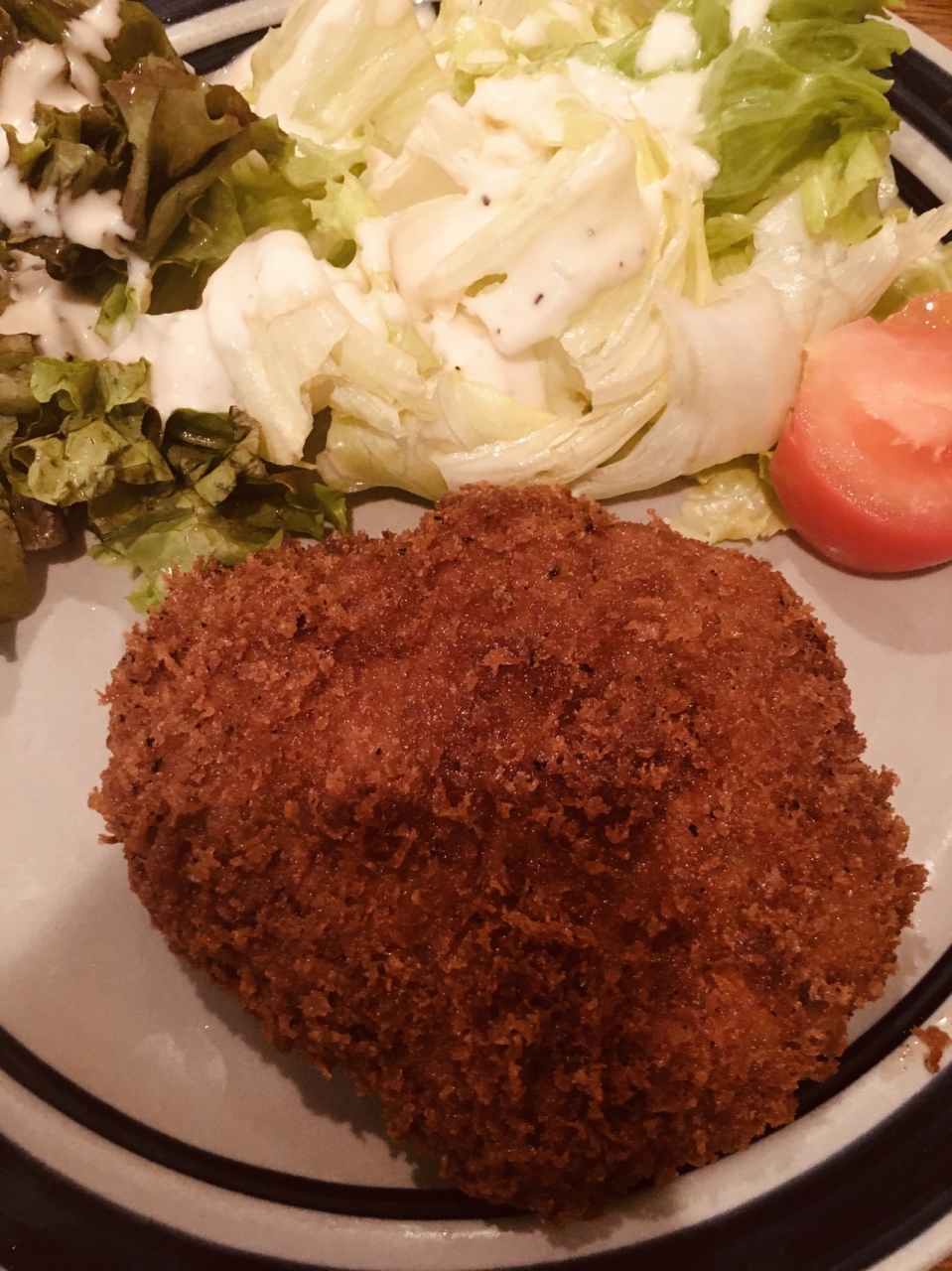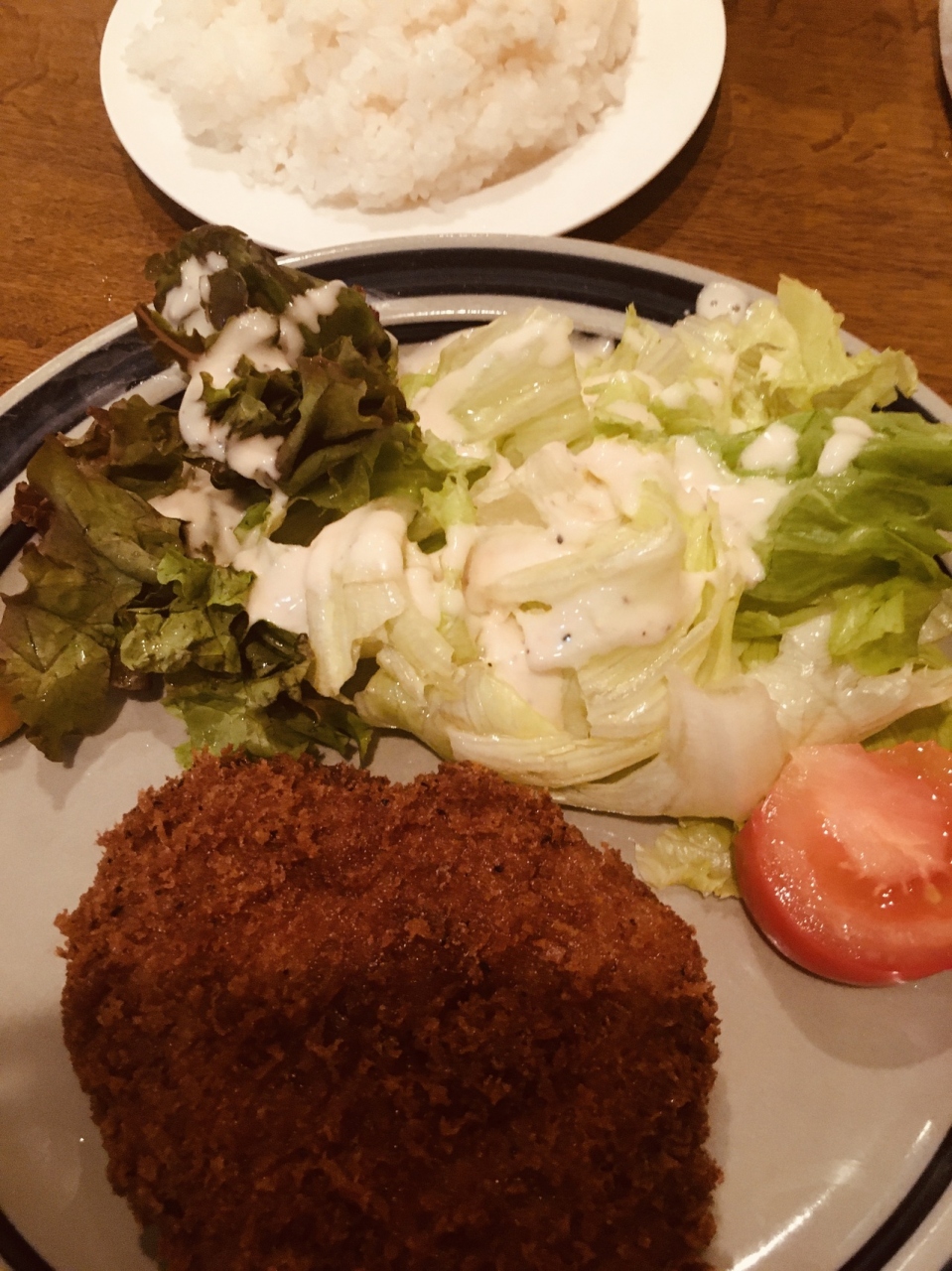 ビルの地下1階にある昔ながらの喫茶店ぽい店内。洋食屋でランチメニューは9種あり、メンチカツライスを食べました。ボリュームがある肉厚のカツで、サラダが添えてあり、ご飯大盛り無料です。店内はテレビの音が響き、カウンター6席、2名掛けのテーブル席が6つある暗がりの店内で、料金は先払いです。