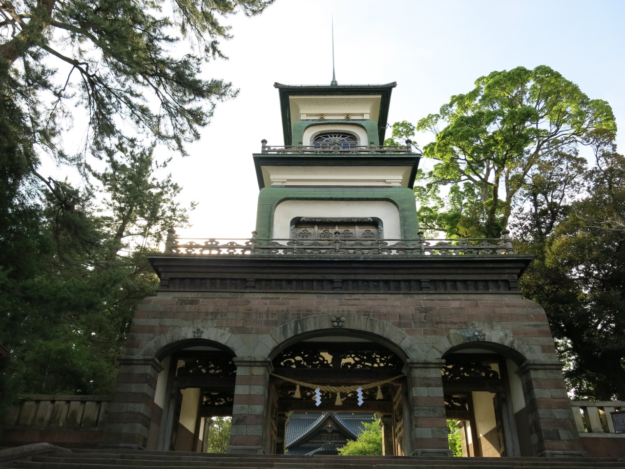 金沢観光でライトアップがオススメな場所を駅の観光案内所で聞いた際に、尾山神社と金沢城の玉泉院丸庭園を教えてもらったので訪ねてみました。夜19時半過ぎに訪れましたが、ギヤマンという色ガラスがはめ込まれた神門がライトアップされた姿はとても印象的で美しかったです。翌日の朝にも再訪しましたが、明るい中でみると神門はまた違った印象でした。境内には前田利家公やお松の方の像などもあり、庭園も見ごたえがありました。