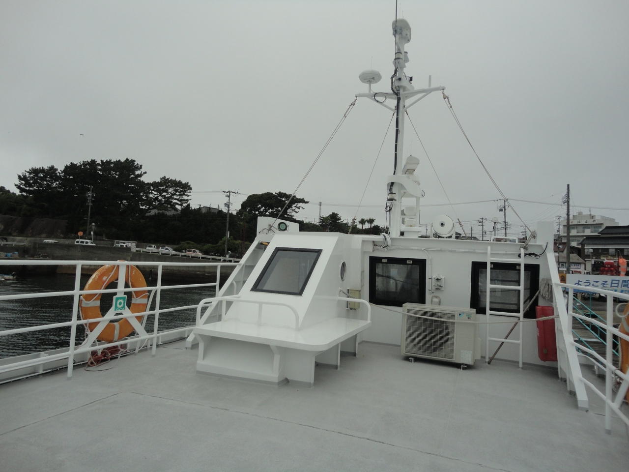高速船の中は、飛行機のように座席が並んでいました。屋上のデッキにも出られて、風に当たりたい人にも良さげでした。