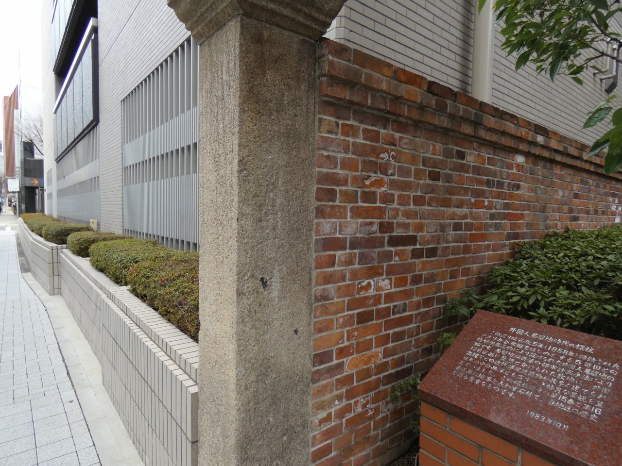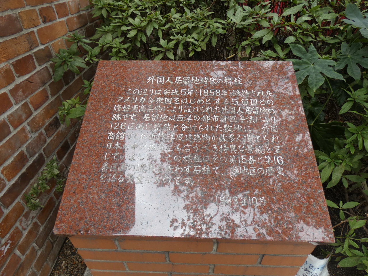 旧神戸居留地の代表的観光スポットの15番館の横に赤煉瓦塀に建つ境界線を示す石造の標柱。旧居留地時代に築かれた物で15番館の付属物で重要文化財になっています。修好条約によって決められたことだそうです。赤煉瓦塀が素敵です。
