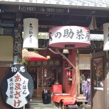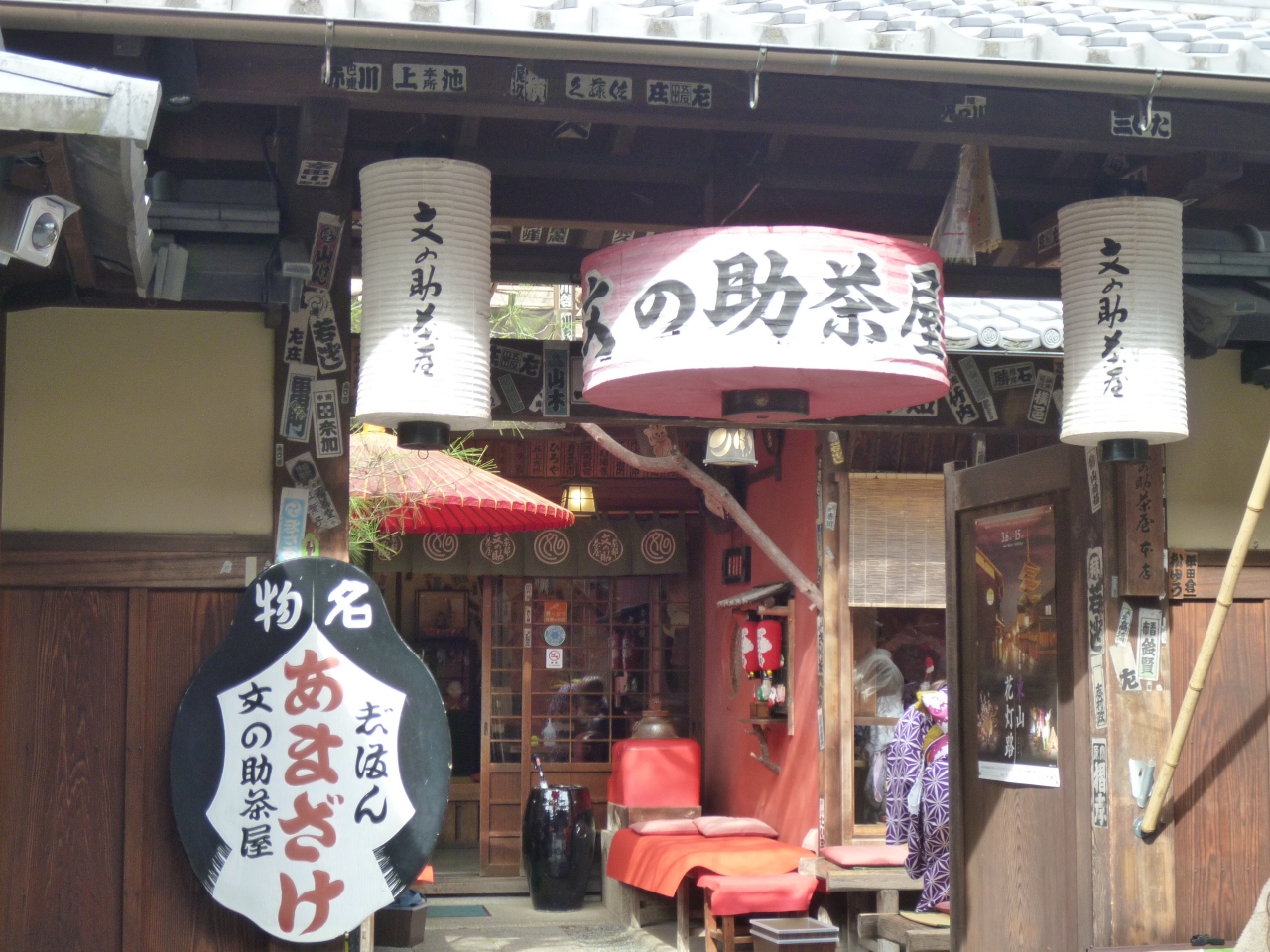 文の助茶屋は、明治末期、噺家の二代目・桂文之助が圓徳院の境内にて、甘酒茶屋をはじめたことに始まっています。テーブルは少ないですが、座席は店内に数席、屋外の番傘の下に数席が配置されていました。今回は抹茶とわらび餅3つがセットの「お抹茶」を注文。三角にカットされた美味しいわらび餅に少々驚きました。きな粉を絡めてプルンプルンなわらび餅をあっという間に頂いてしまいました。ニッキの効いていておいしかったです。