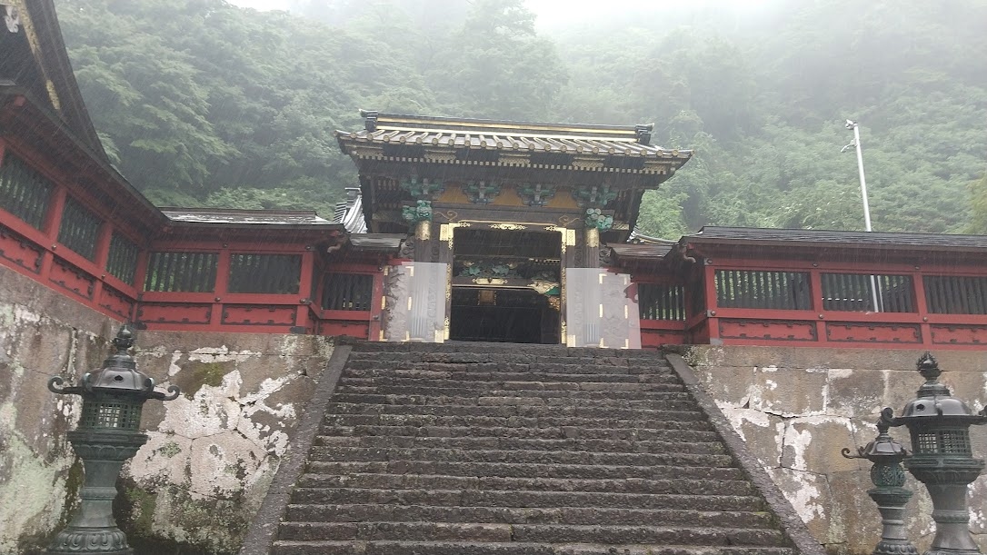妙義神社山門の総門から見上げるところにある神社本殿の門で、165段の急な石段を登っていきます。昔ながらの石段を残しているので、歩きにくい石段ですが、登り切ったところにあるのが唐門で彫刻に覆われた立派な門で、本殿への入口になります。