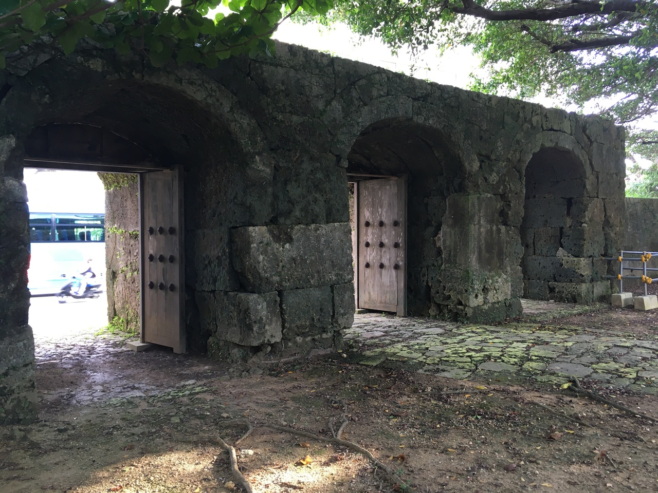 ゆいレール「牧志駅」から徒歩で10 分くらいです。「崇元寺通り」に面してさりげなく琉球石灰岩でできた重厚な3連アーチの石門が建っています。琉球歴代王の霊を祀った寺で、首里の円覚寺と共に琉球双璧の名刹でしたが、沖縄戦で焼失してしまいました。現在の石門は、戦後修復されたものです。国の重要文化財です。門を潜るとガジュマル?の巨木の枝葉が大変見事でした。