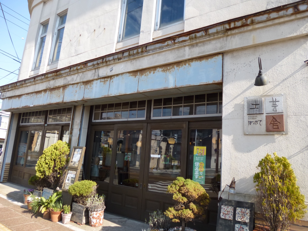 路面電車の十字街電停の目の前にあるのが、はこだて工芸舎です。坂本龍馬記念館のすぐ近くで、陶芸家 堂前守人が主催する工芸ギャラリーです。工房で作られた陶芸やの他、衣服やアクセサリーもあります。この建物は旧梅津商店で、酒類・食料品卸の会社だったそうです。北洋漁業で函館が賑わっていたころ、この辺りは船員たちの歓楽街「銀座通り」の入り口で、この梅津商店の建物はシンボル的な存在だったようです。