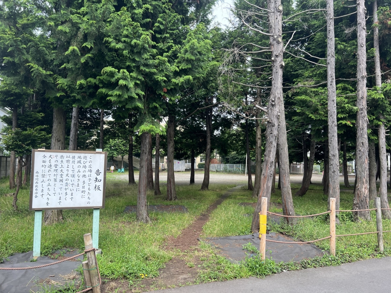 小田急線の南林間駅から、駅前の目抜き通りになっているやまと根岸通りを西へ1キロのところにある広場です。遊具のようなものはありませんが、子どもや地域の人たちのフリースペースになっているようです。入口には告知板があり、糞などの衛生上の理由で、犬を連れての立ち入りは全面禁止と書かれています。