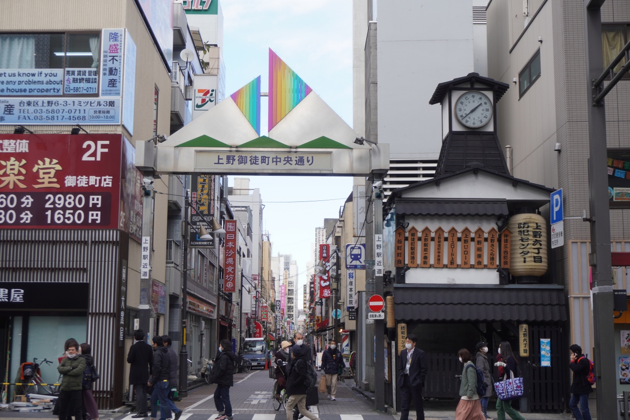 御徒町中央通りは、御徒町駅から上野駅まで山手線の東側を南北に結ぶ通り。焼肉屋さんとかラーメン屋さんとか上野らしいリーズナブルな飲食店が多い通り。アメ横より飲食店はこちらの方が多いので、そういう意味では使い分けができると思います。