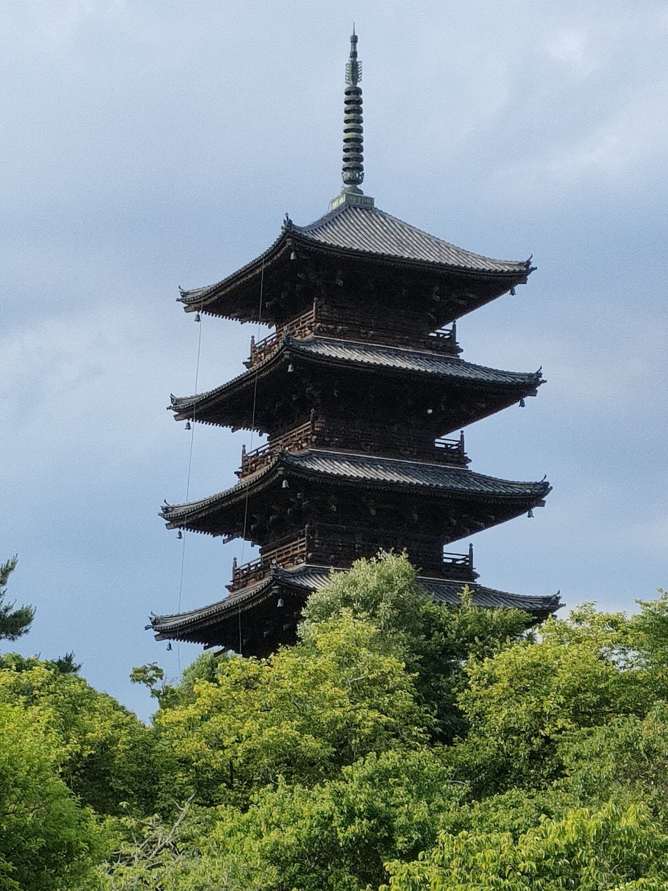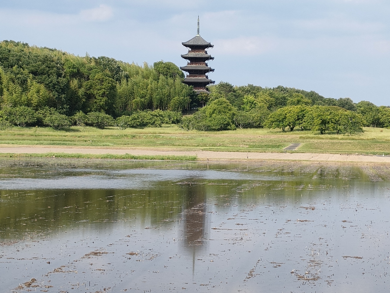 現在伽藍の大半は江戸時代に再興されたもの。五重塔のスタイルも興福寺や瑠璃光寺に比べると劣るが、遠くから畑の先に見る塔は美しい。
