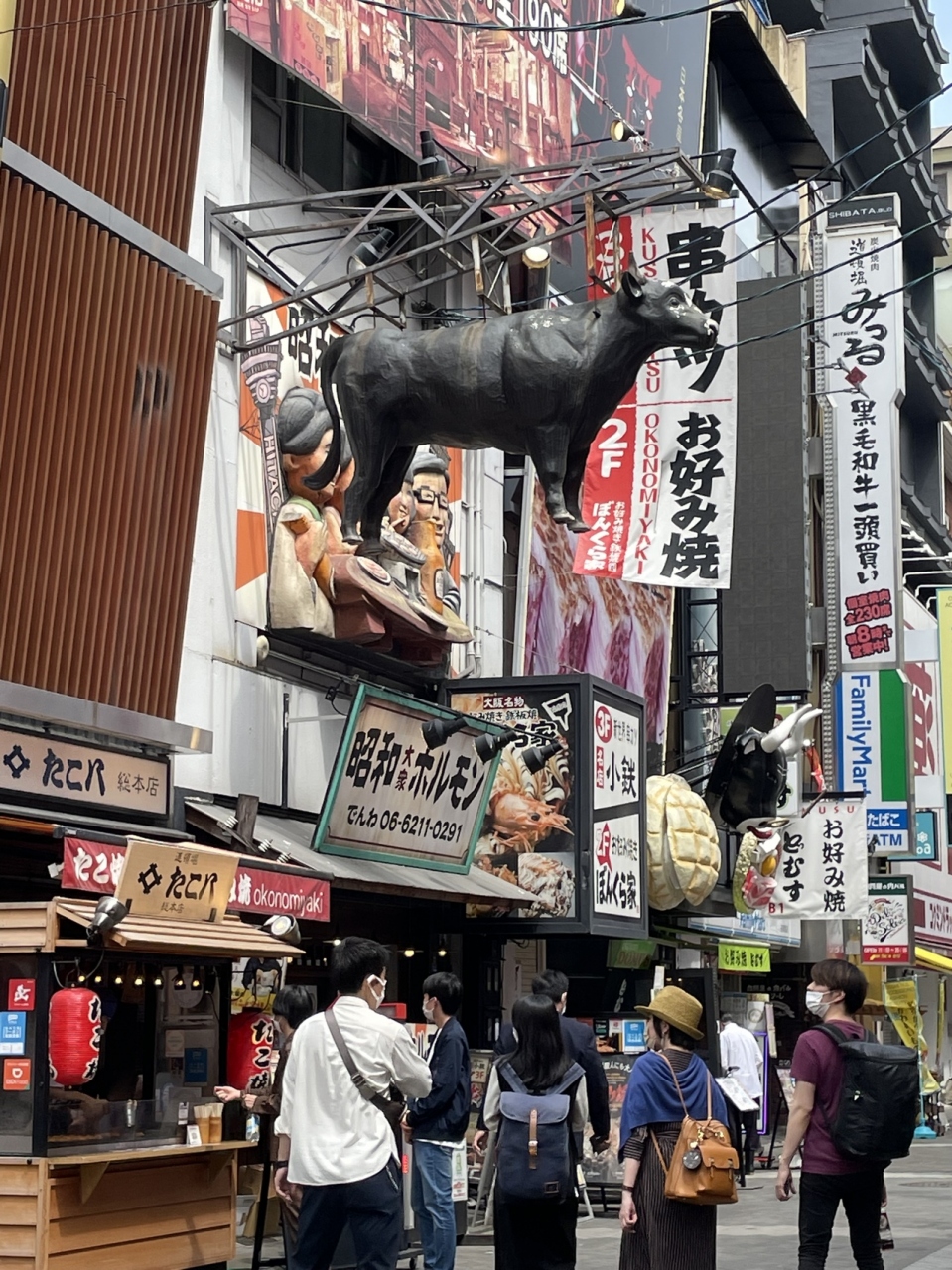 道頓堀の通りの真ん中あたり、店頭を見上げると牛がそのまま一頭まるまる吊られています。ホルモン焼肉のチェーン店です。ちょっと懐かしい昭和の庶民的な雰囲気に演出された店内では、昼飲みの観光客も結構見られました。