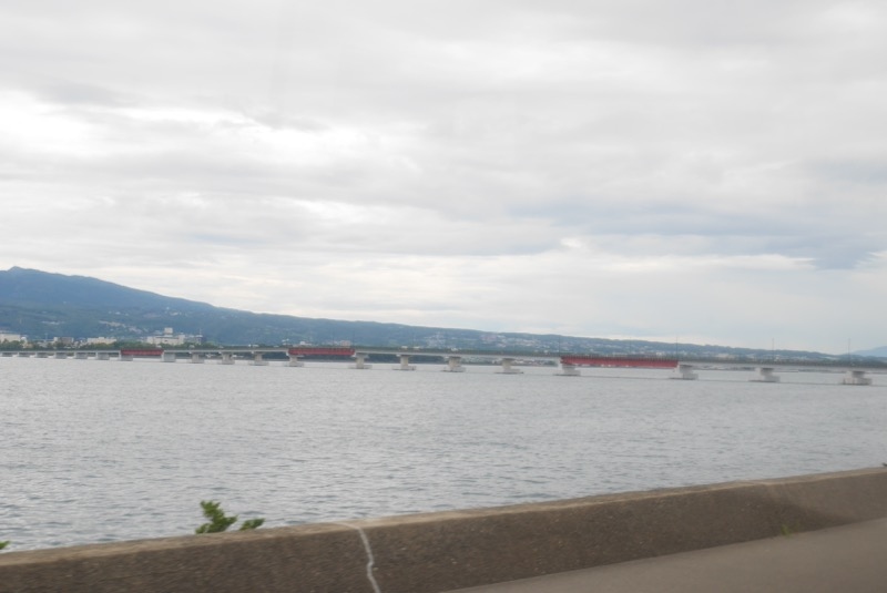 長崎空港と本土とをつなぐ橋です。赤がアクセント。長崎空港は海につきでた滑走路でも有名ですが、そちらが赤一色なのにたいして、こちらは意外とそうでもありません。関空の橋よりは短いかな?という体感的な印象を受けました。なおちなみに、橋を渡りきった先に大村市のモニュメントがお出迎えしてくれます。