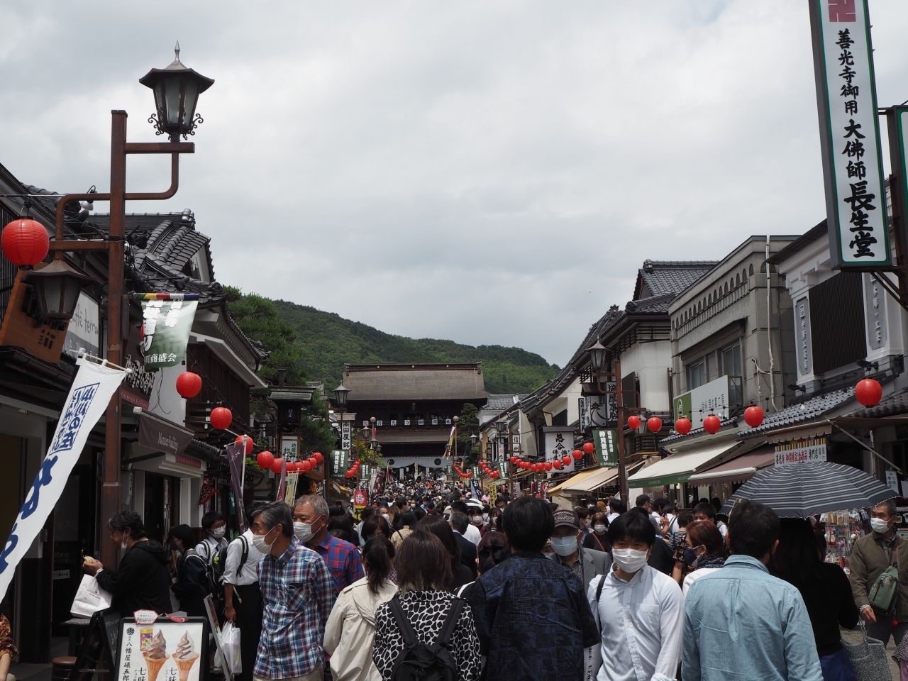 善光寺の南側の仁王門から山門までの200メートルほどの通りが仲見世通りです。通りの両側には信州の特産の店やお土産店やおやきとかのファーストフード的な店から信州そばの店などが並んでいます。人通りも多くにぎやかで、多くの店にはたくさんの人が店頭や店の中へと入って行きます。善光寺の参拝の後はちょっとおいしいものを食べたりと楽しい通りです。
