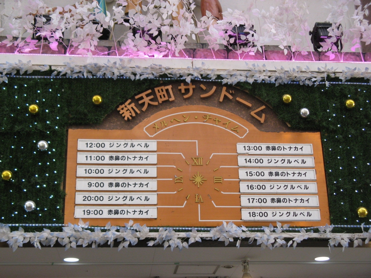 地下鉄天神駅から歩いてすぐ、新天町商店街のアーケードにある大きな“からくり時計”です。昭和56年に設置されたそうで、日本一大きな時計塔だそうです。その名の通り、メルヘンチックなとても可愛らしい時計塔で、9時から20時まで、正時毎に色んなメロディ(添付写真を参照ください)が流れる仕掛けになっています。