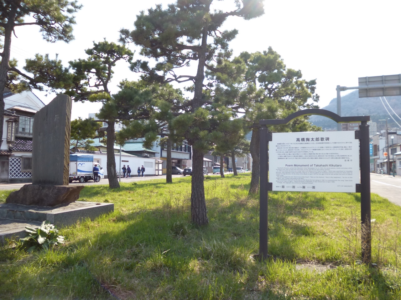 函館の市電、宝来町の駅のそば、グリーンベルトに歌碑があります。歌碑から西側を見ると、白い御影石の台座の上に、高田屋嘉兵衛の像、その向こうに函館山という光景を見ることができます。昭和6年に函館の当時の繁華街「銀座通」をモデルにしたと言われている大ヒット曲「酒は涙か溜息か」の作詞家です。「ここに幸あり」など、どこかで聞かれた歌も多いのでは。