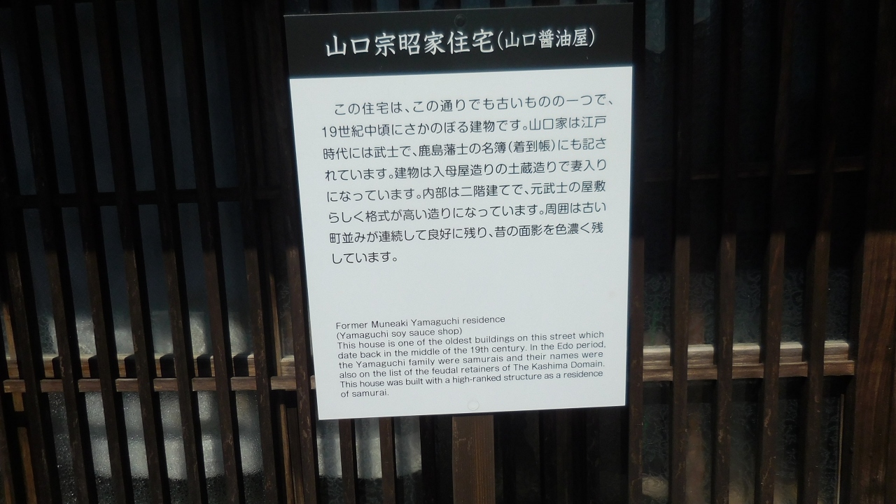 酒蔵通りに面した重厚な建物で、特徴的ななまこ壁をもつ蔵造りの建物は19世紀中頃の建築とされる。山口家は江戸時代は鹿島藩の武士で、現在は味噌醤油の醸造を行っている。お願いすれば店内を見ることが出来、土間には長年使われている醤油樽が並んでいる。
