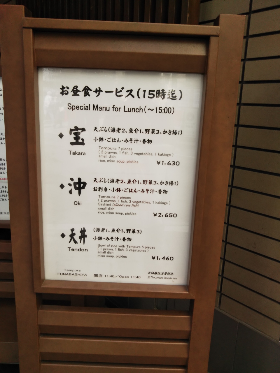 天ぷら 船橋屋 新宿本店、以前はランチタイムは混んでいて中々入れなかったのですが、今回行ってみると店内はガラガラでした。海外の人も少なかったです。老舗の天ぷらや三なので敷居が高そうですが、ランチですとランチメニューがあってリーズナブルです。