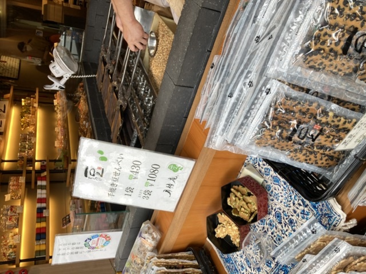 錦市場店と比べると入りやすく、見やすいお店です。店頭に出ている豆せんべいは試食させていただけます。