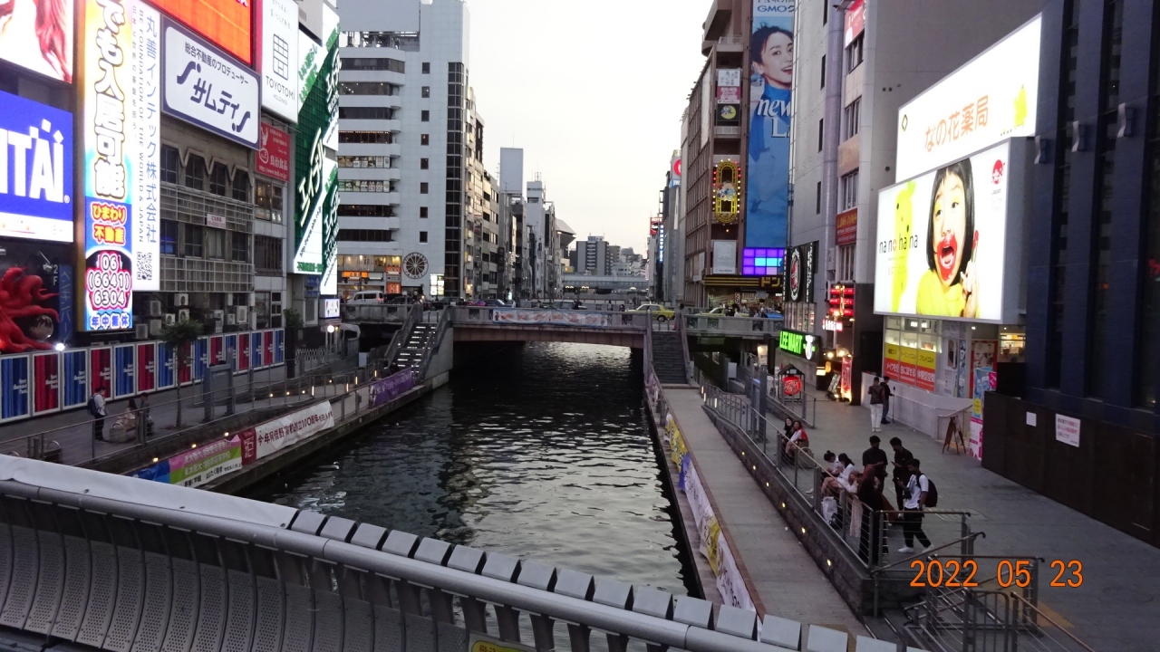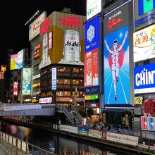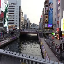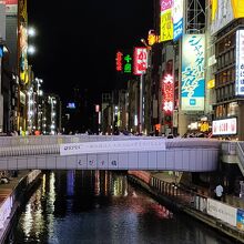 難波駅から徒歩で10分ほどです。戎橋で戎橋筋と交差しています。と言うより、「グリコのネオンサインの前の川」と言う方が、旅行者にはわかりやすいでしょう。