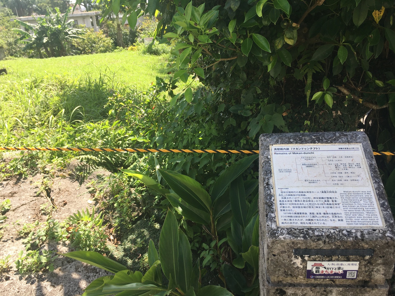 ゆいレール「儀保駅」から徒歩で20分ほどです。「琉染」という紅型工房の脇の道を北へ少し入ったところの空き地です。案内板以外は何もありませんでした。説明によれば、聞得大君(ちふぃじん)に仕える三大神女の一人、真壁大阿母志良礼(まかんうふあむしあれ)の屋敷跡です。この神女は首里の真和志平等と久米、八重山などを管轄しましたとのこと。