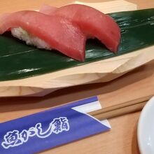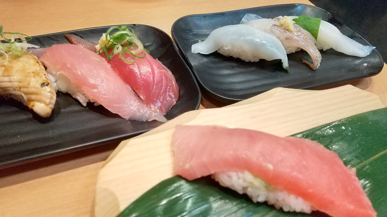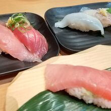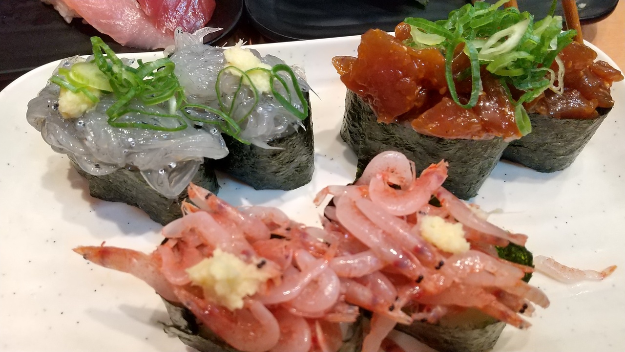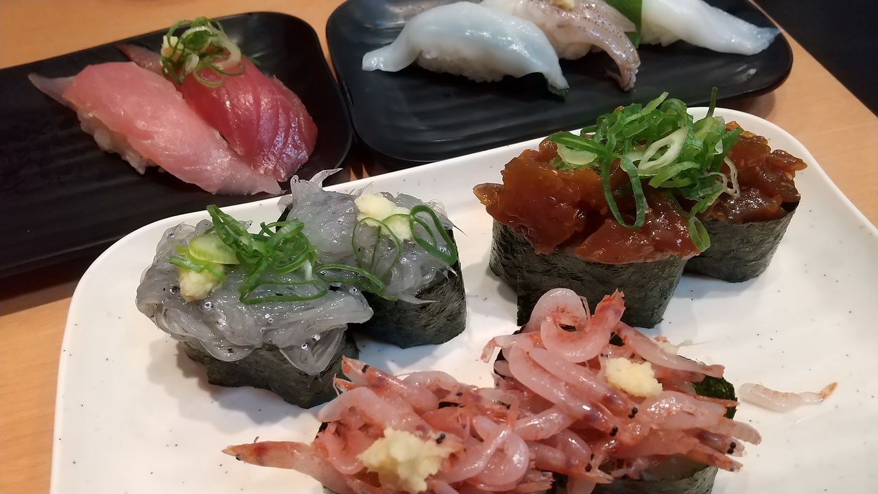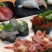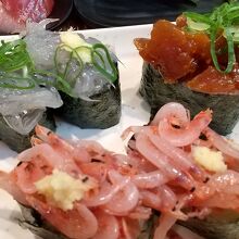 本日のお勧めの桜えび、しらす。人気の中トロはネタが大きく食べごたえがあり美味しかった。穴子はフワフワでとろける食感でした。