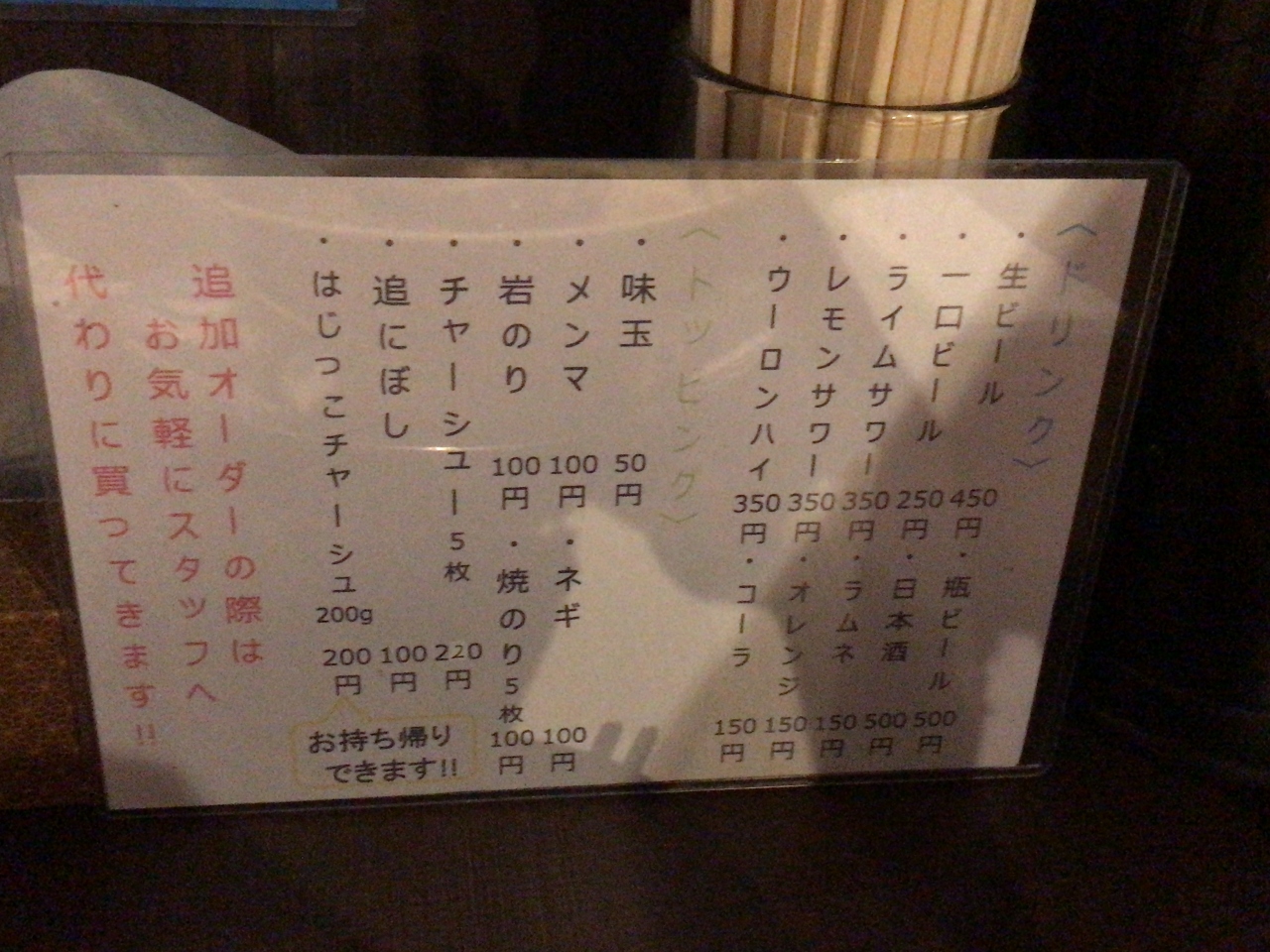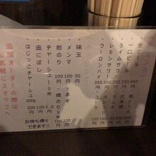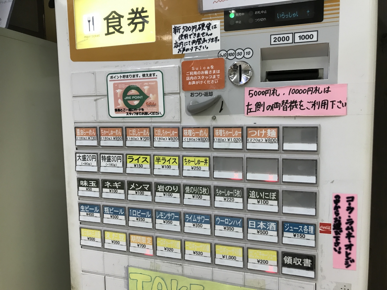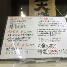 メインとしているのは醤油味でしょうか? お店の前に詳しいラーメンの説明があるのでじっくり眺めてから決めるのもアリそうです。食券機制で現金以外に交通系ICカードでの決済も可能ですが、ICカード決済の場合は店員に声掛けをしてとのこと。大盛や特盛がありますが追加料金がそれぞれ20,30円なのは何かのバグ?と思ってしまうところです。