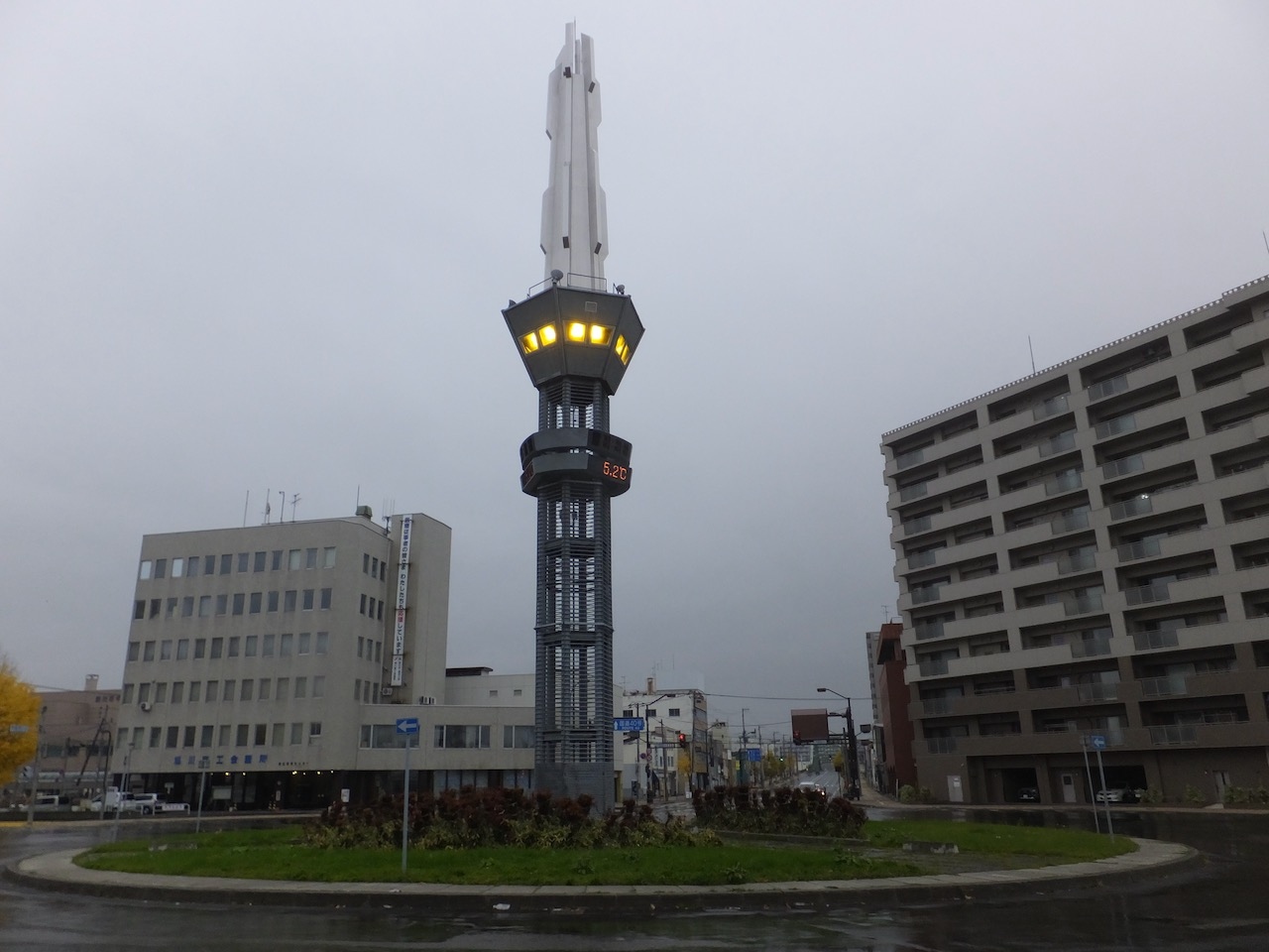 市街地の外れにあるロータリー交差点。6叉路です。その真ん中に高い塔がそびえてます。シンボルタワーです。大きなロータリー用の照明として便利な構造なのでしょう。