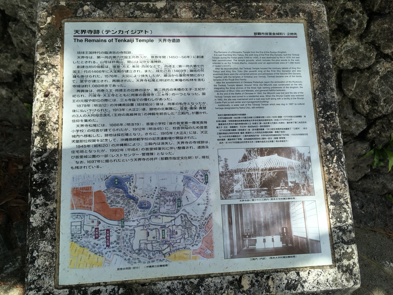 「守礼門」から徒歩で西へ2分ほどです。「首里城前」交差点角「首里城管理センター」に説明板のみが立っています。首里王府時代に天王寺、安国寺と共に建てられた臨済宗の寺院です。また円覚寺、天王寺と共に王家の菩提寺でもあります。国王の元服や即位の際、三ヶ寺詣の慣わしもあったそうです。今は首里城公園の管理センターが跡地に建っています。