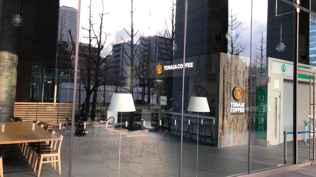 トラジャコーヒーは、大阪の京橋など、関西でチェーン展開しているカフェです。こちらの本町南店は、オフィスビルの1Fエントランスにあります。開放感ある店内が特徴的です。オフィスビルなので、土日や休みです。