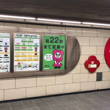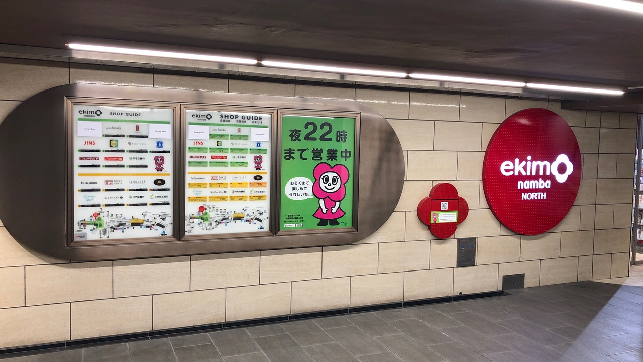 御堂筋線なんば駅の改札外にある小さな地下街です。中央に改札口があり、その改札を挟むように
