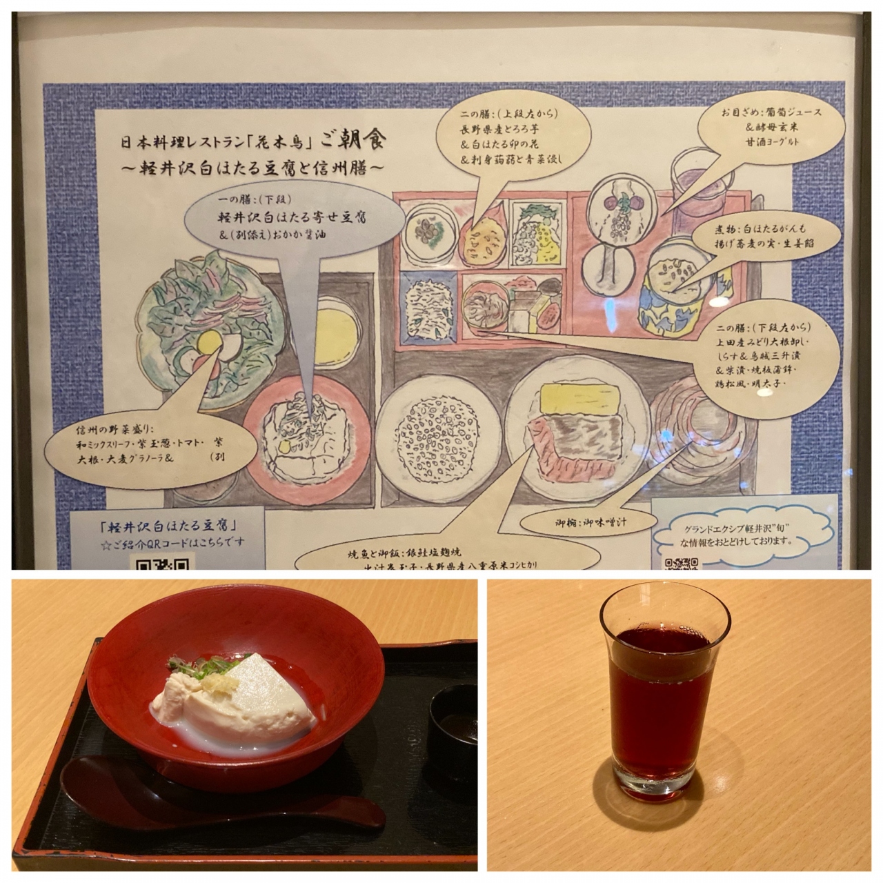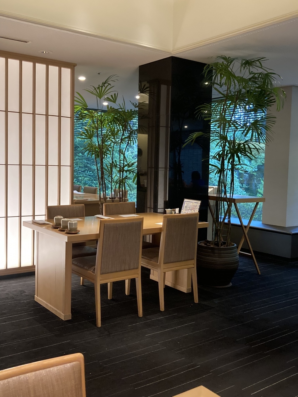 本館の和食レストラン「花木鳥」で朝食をいただきました。テーブル間が広くコロナ感染対策はキチンとしていました。