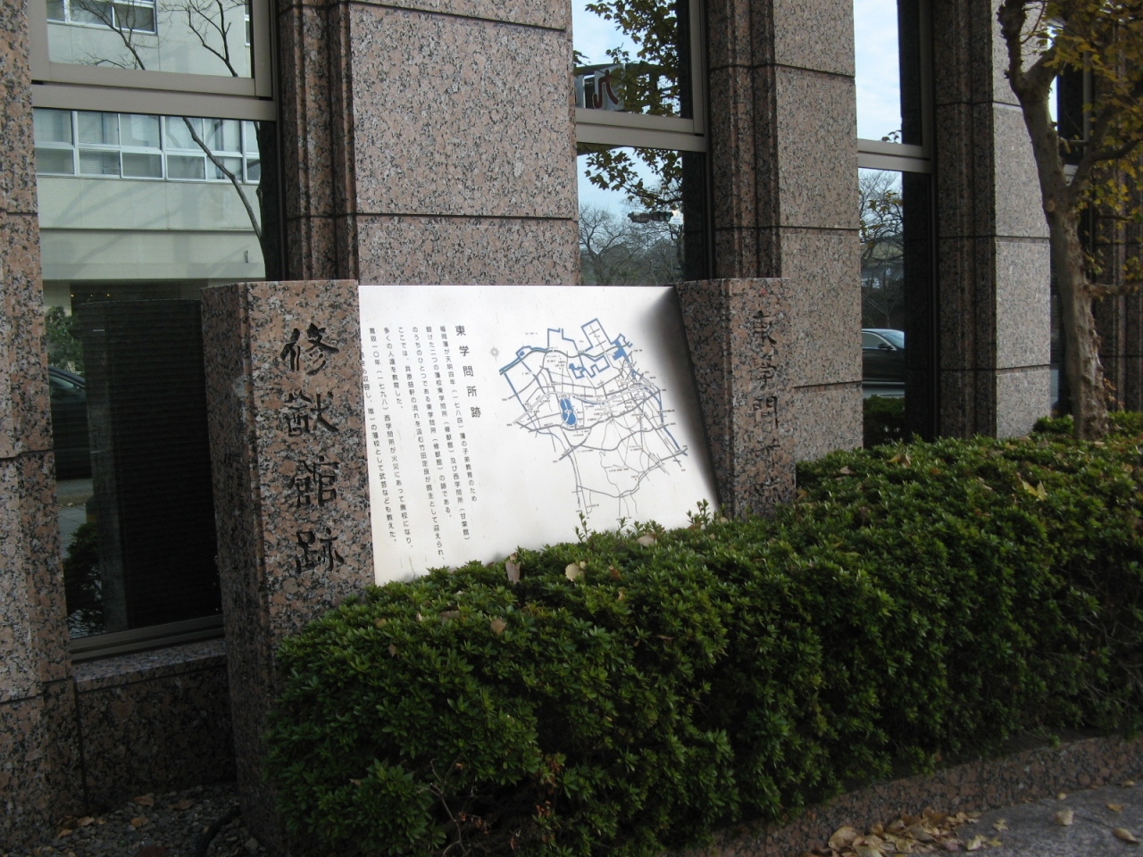 地下鉄赤坂駅から西に歩いて2~3分、三井住友海上福岡赤坂ビルの西側の植え込みに「東学問所修猷館跡碑」がありました。説明板によると、福岡藩が天明4年(1784年)に藩の子弟教育のために設けた学問所だそうです。石碑があるだけで、遺構はなにものこっていませんが、説明板には、地図も掲載されていて東学問所(修猷館)と西学問所(甘棠館)や福岡城の位置関係がよく判りました。