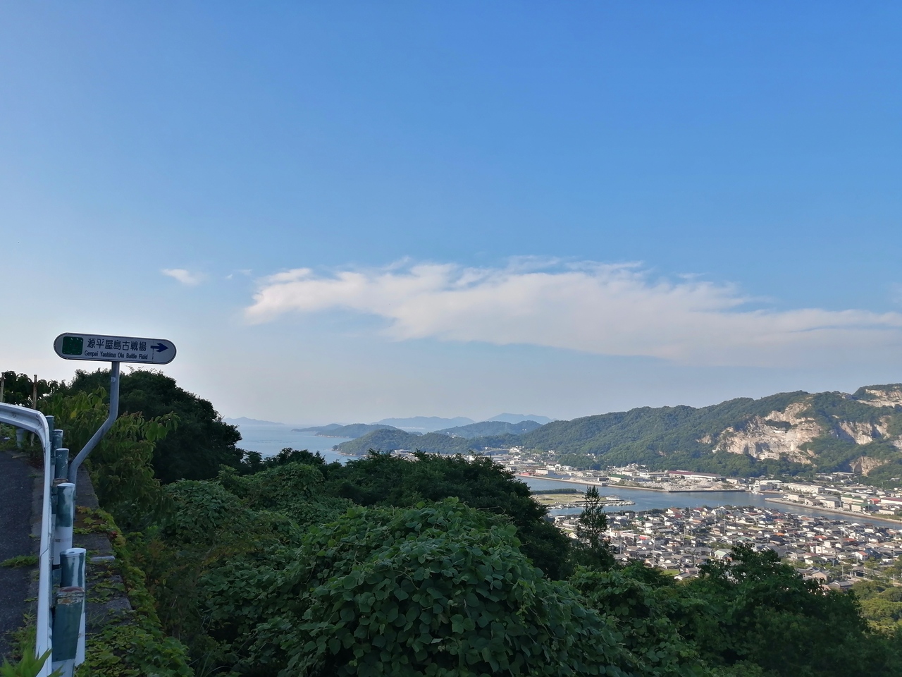 くねくねと細い道路に源平屋島古戦場と書かれた矢印があり、戦場跡を眺めることのできる場所でした。3台くらいの車が停めることが出来て、眼下にのぞむ景色は海と民家でとても綺麗でした。この辺りで源平合戦があったのねという感じでした。